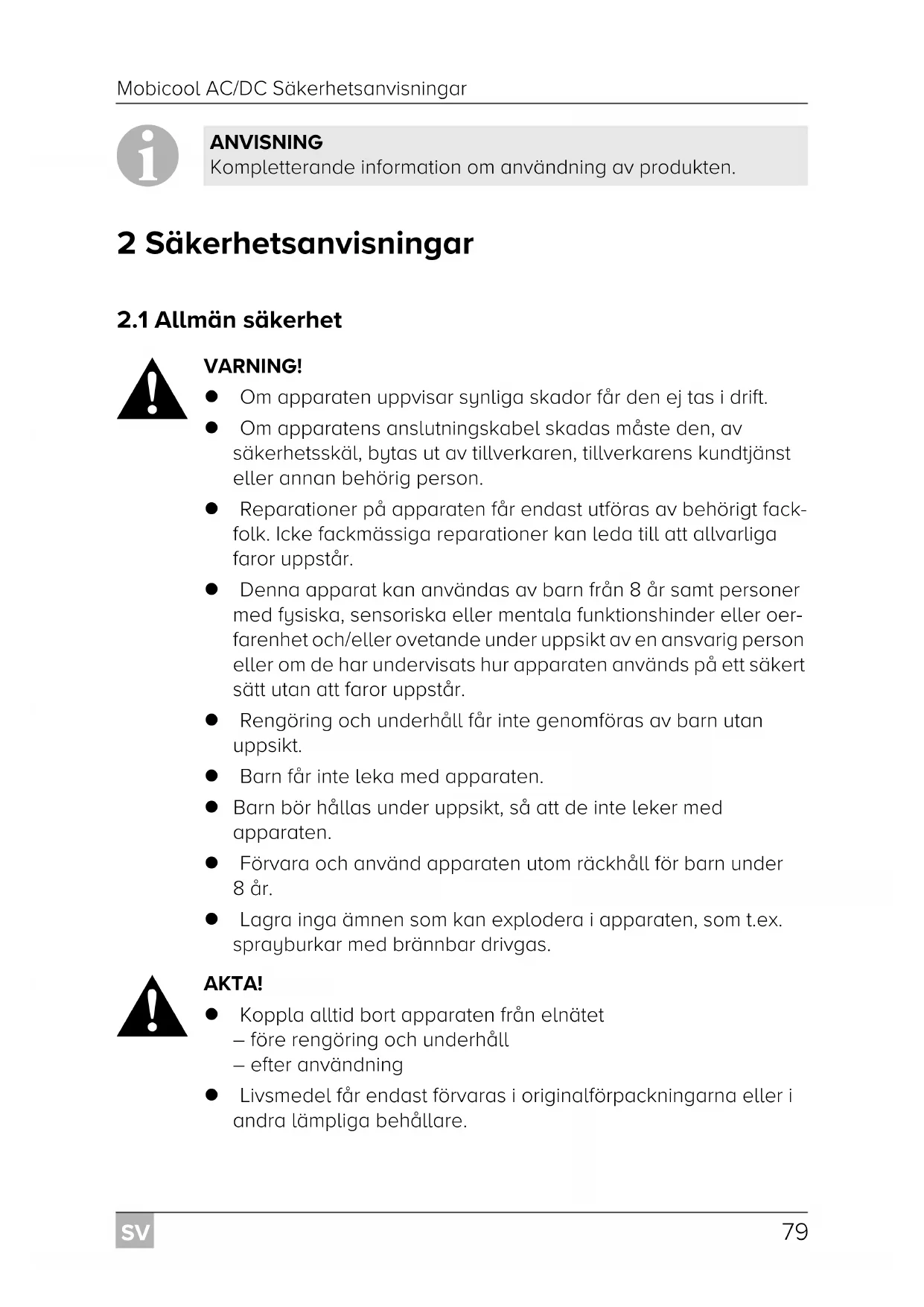 AKTA! Koppla alltid bort apparaten från elnätet – före rengöring och underhåll – efter användning Livsmedel får endast förvaras i originalförpackningarna eller i andra lämpliga behållare. ANVISNING Kompletterande information om användning av produkten. Mobicool-AC-DC--O-16s.book Seite 79 Montag, 8. Januar 2018 6:11 18SV Säkerhetsanvisningar Mobicool AC/DC