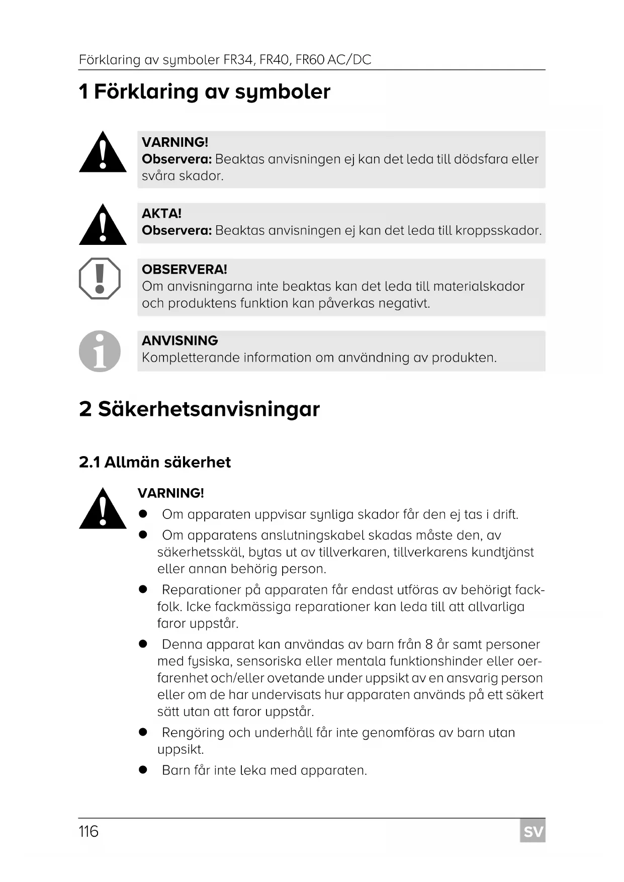 VARNING! Om apparaten uppvisar synliga skador får den ej tas i drift. Om apparatens anslutningskabel skadas måste den, av säkerhetsskäl, bytas ut av tillverkaren, tillverkarens kundtjänst eller annan behörig person. Reparationer på apparaten får endast utföras av behörigt fack- folk. Icke fackmässiga reparationer kan leda till att allvarliga faror uppstår. Denna apparat kan användas av barn från 8 år samt personer med fysiska, sensoriska eller mentala funktionshinder eller oer- farenhet och/eller ovetande under uppsikt av en ansvarig person eller om de har undervisats hur apparaten används på ett säkert sätt utan att faror uppstår. Rengöring och underhåll får inte genomföras av barn utan uppsikt. Barn får inte leka med apparaten. VARNING! Observera: Beaktas anvisningen ej kan det leda till dödsfara eller svåra skador. AKTA! Observera: Beaktas anvisningen ej kan det leda till kroppsskador. OBSERVERA! Om anvisningarna inte beaktas kan det leda till materialskador och produktens funktion kan påverkas negativt. ANVISNING Kompletterande information om användning av produkten. FR34-FR40-FR60--O-16s.book Seite 116 Donnerstag, 19. Juli 2018 3:22 15SV FR34, FR40, FR60 AC/DC Säkerhetsanvisningar
