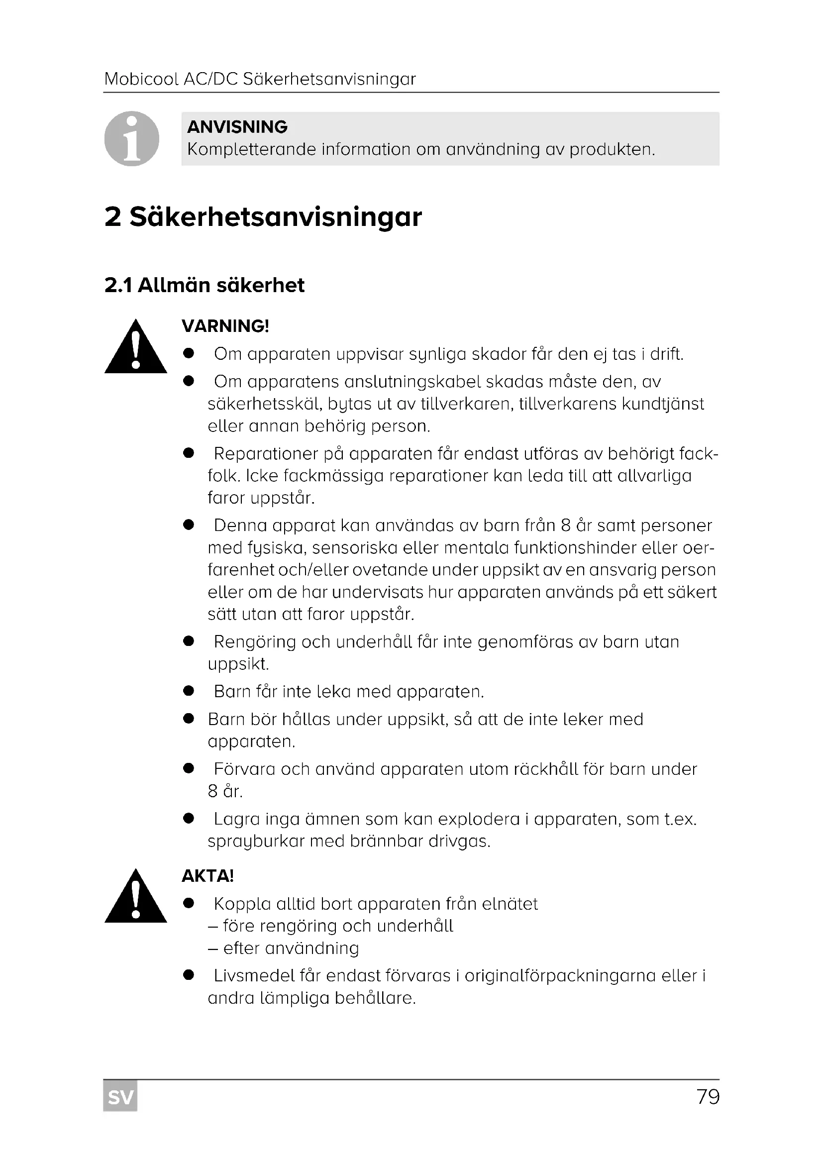 AKTA! Koppla alltid bort apparaten från elnätet – före rengöring och underhåll – efter användning Livsmedel får endast förvaras i originalförpackningarna eller i andra lämpliga behållare. ANVISNING Kompletterande information om användning av produkten. Mobicool-AC-DC--O-16s.book Seite 79 Montag, 8. Januar 2018 6:11 18SV Säkerhetsanvisningar Mobicool AC/DC
