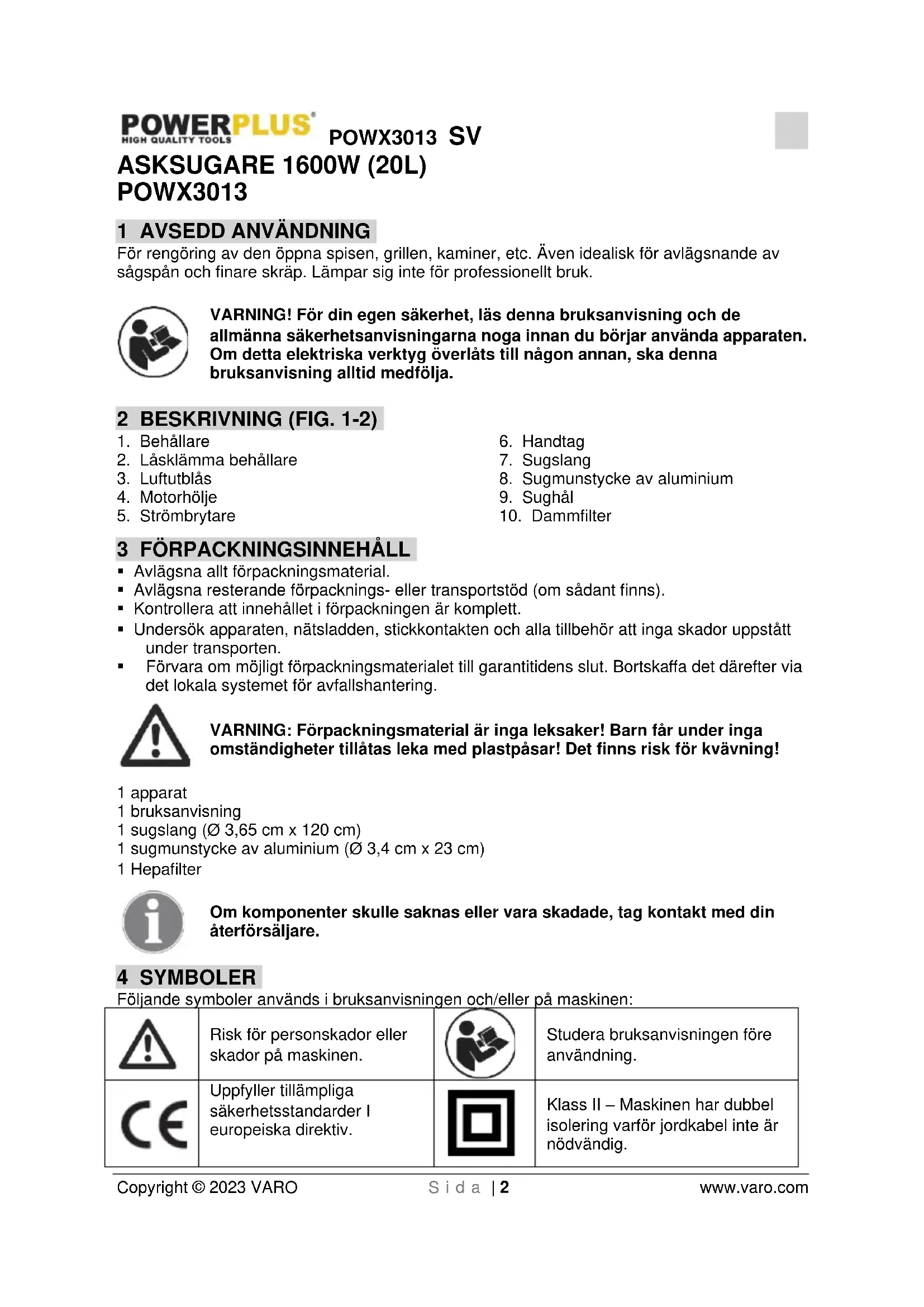 Om du efter en tid beslutar dig för att byta ut maskinen får den inte hanteras som hushållsavfall, den ska kasseras på ett miljövänligt sätt. Avfall som produceras av elektriska maskiner får inte hanteras på samma sätt som vanligt hushållsavfall. Ta avfallet till en återvinningscentral om det finns en sådan anläggning. Rådgör med lokala myndigheter eller försäljaren för rekommendationer om insamling och återvinning.POWX3013 FI Copyright © 2023 VARO S i v u | 1 www.varo.com