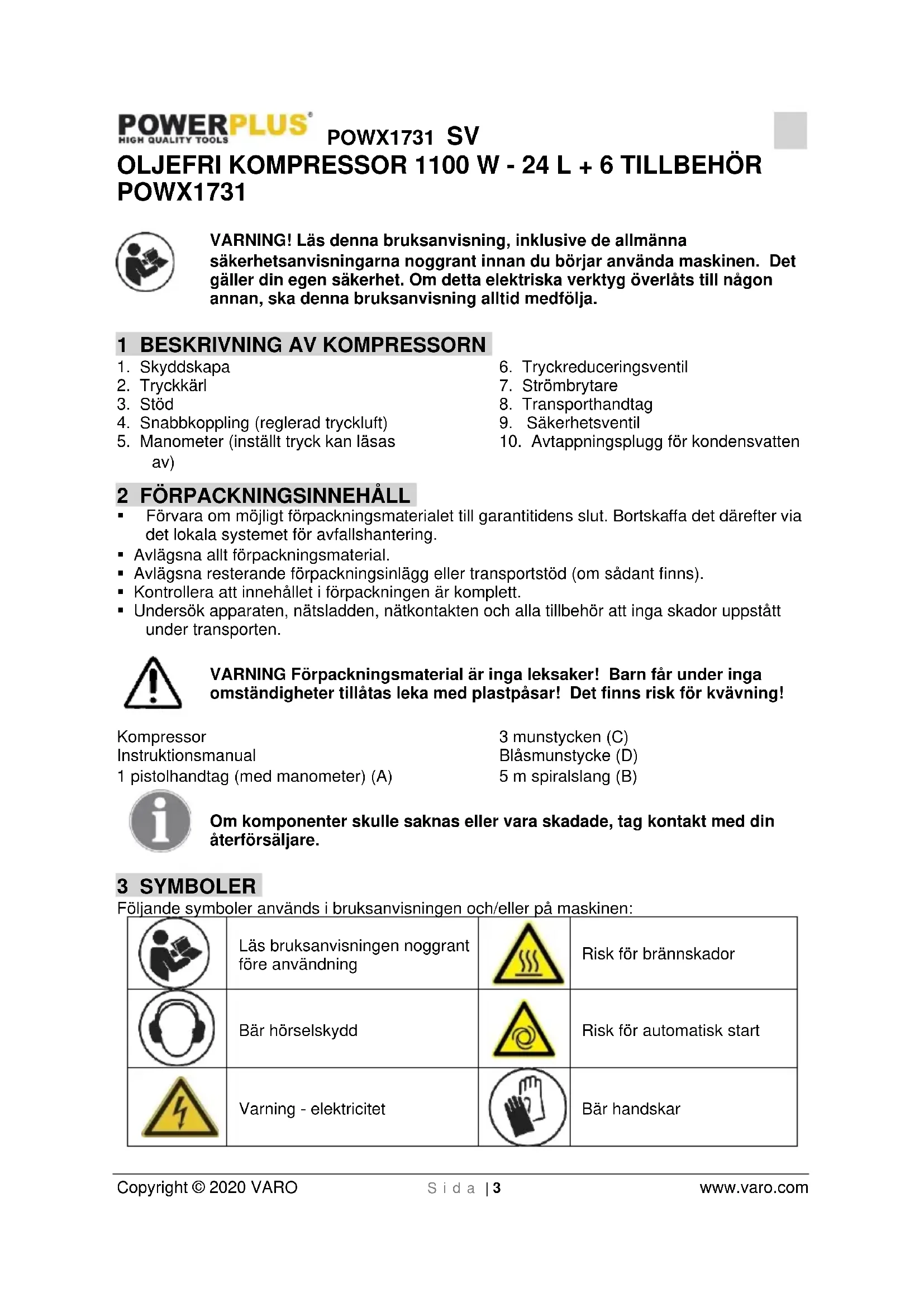 Copyright © 2020 VARO S i d a | 3 www.varo.com OLJEFRI KOMPRESSOR 1100 W - 24 L + 6 TILLBEHÖR POWX1731 VARNING! Läs denna bruksanvisning, inklusive de allmänna säkerhetsanvisningarna noggrant innan du börjar använda maskinen. Det gäller din egen säkerhet. Om detta elektriska verktyg överlåts till någon annan, ska denna bruksanvisning alltid medfölja.