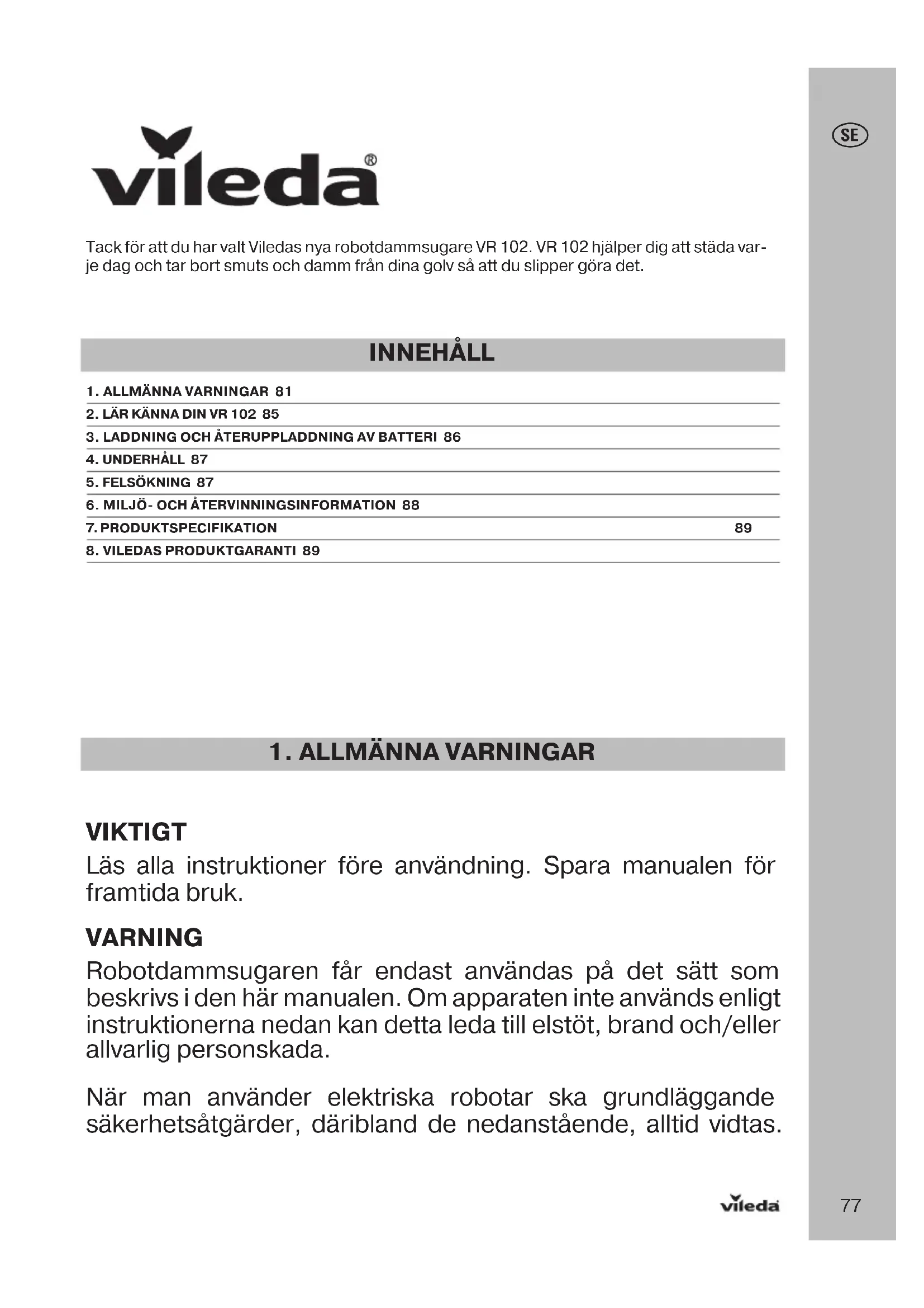 VIKTIGT Läs alla instruktioner före användning. Spara manualen för framtida bruk. VARNING Robotdammsugaren får endast användas på det sätt som beskrivs i den här manualen. Om apparaten inte används enligt instruktionerna nedan kan detta leda till elstöt, brand och/eller allvarlig personskada. När man använder elektriska robotar ska grundläggande säkerhetsåtgärder, däribland de nedanstående, alltid vidtas. Tack för att du har valt Viledas nya robotdammsugare VR 102. VR 102 hjälper dig att städa var- je dag och tar bort smuts och damm från dina golv så att du slipper göra det. INNEHÅLL 1. ALLMÄNNA VARNINGAR 812. LÄR KÄNNA DIN VR 102 853. LADDNING OCH ÅTERUPPLADDNING AV BATTERI 864. UNDERHÅLL 875. FELSÖKNING 876. MILJÖ- OCH ÅTERVINNINGSINFORMATION 887. PRODUKTSPECIFIKATION 898. VILEDAS PRODUKTGARANTI 8978