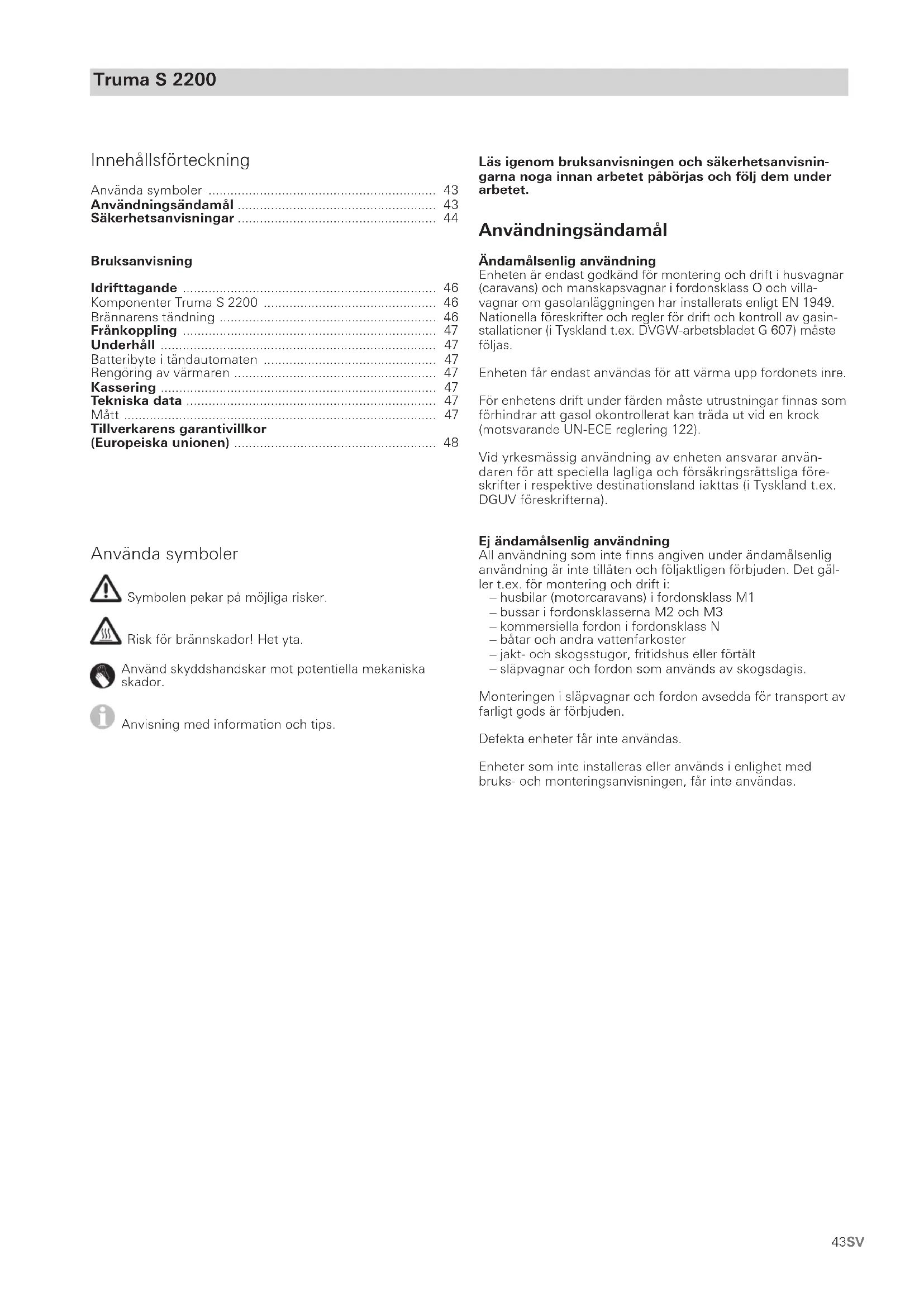 - Garantien gøres gældende hos en autoriseret servicepartner eller i Trumas serviceafdeling. Alle adresser og telefonnumre findes under www.truma.com under faneblandet »Service«. Producentens adresse: Truma Gerätetechnik GmbH & Co. KG Truma Servicezentrum Wernher-von-Braun-Straße 12 85640 Putzbrunn, Tyskland For at sikre et smidigt forløb beder vi om, at man har følgende oplysninger klar ved kontakt: – detaljeret beskrivelse af manglen – anlæggets serienummer – købsdato Den autoriserede servicepartner eller Trumas serviceafdeling fastsætter i det enkelte tilfælde, hvad der skal ske i det videre forløb. For at undgå eventuelle transportskader må det pågæl- dende anlæg kun afsendes efter forudgående aftale med den autoriserede servicepartner eller Trumas serviceafdeling. Hvis garantisagen anerkendes af producenten, påtager produ- centen sig transportomkostningerne. Såfremt der ikke forelig- ger en garantisag, informeres forbrugeren, og reparations- og transportomkostningerne afholdes af denne. Vi anmoder om, at der ikke indsendes anlæg uden forudgående aftale.43SV Truma S 2200 Läs igenom bruksanvisningen och säkerhetsanvisnin- garna noga innan arbetet påbörjas och följ dem under arbetet. Användningsändamål Ändamålsenlig användning Enheten är endast godkänd för montering och drift i husvagnar (caravans) och manskapsvagnar i fordonsklass O och villa- vagnar om gasolanläggningen har installerats enligt EN 1949. Nationella föreskrifter och regler för drift och kontroll av gasin- stallationer (i Tyskland t.ex. DVGW-arbetsbladet G 607) måste följas. Enheten får endast användas för att värma upp fordonets inre. För enhetens drift under färden måste utrustningar finnas som förhindrar att gasol okontrollerat kan träda ut vid en krock (motsvarande UN-ECE reglering 122). Vid yrkesmässig användning av enheten ansvarar använ- daren för att speciella lagliga och försäkringsrättsliga före- skrifter i respektive destinationsland iakttas (i Tyskland t.ex. DGUV föreskrifterna). Ej ändamålsenlig användning All användning som inte finns angiven under ändamålsenlig användning är inte tillåten och följaktligen förbjuden. Det gäl- ler t.ex. för montering och drift i: – husbilar (motorcaravans) i fordonsklass M1 – bussar i fordonsklasserna M2 och M3 – kommersiella fordon i fordonsklass N – båtar och andra vattenfarkoster – jakt- och skogsstugor, fritidshus eller förtält – släpvagnar och fordon som används av skogsdagis. Monteringen i släpvagnar och fordon avsedda för transport av farligt gods är förbjuden. Defekta enheter får inte användas. Enheter som inte installeras eller används i enlighet med bruks- och monteringsanvisningen, får inte användas. Använda symboler Symbolen pekar på möjliga risker. Risk för brännskador! Het yta. Använd skyddshandskar mot potentiella mekaniska skador. Anvisning med information och tips. Innehållsförteckning Använda symboler p. 43
