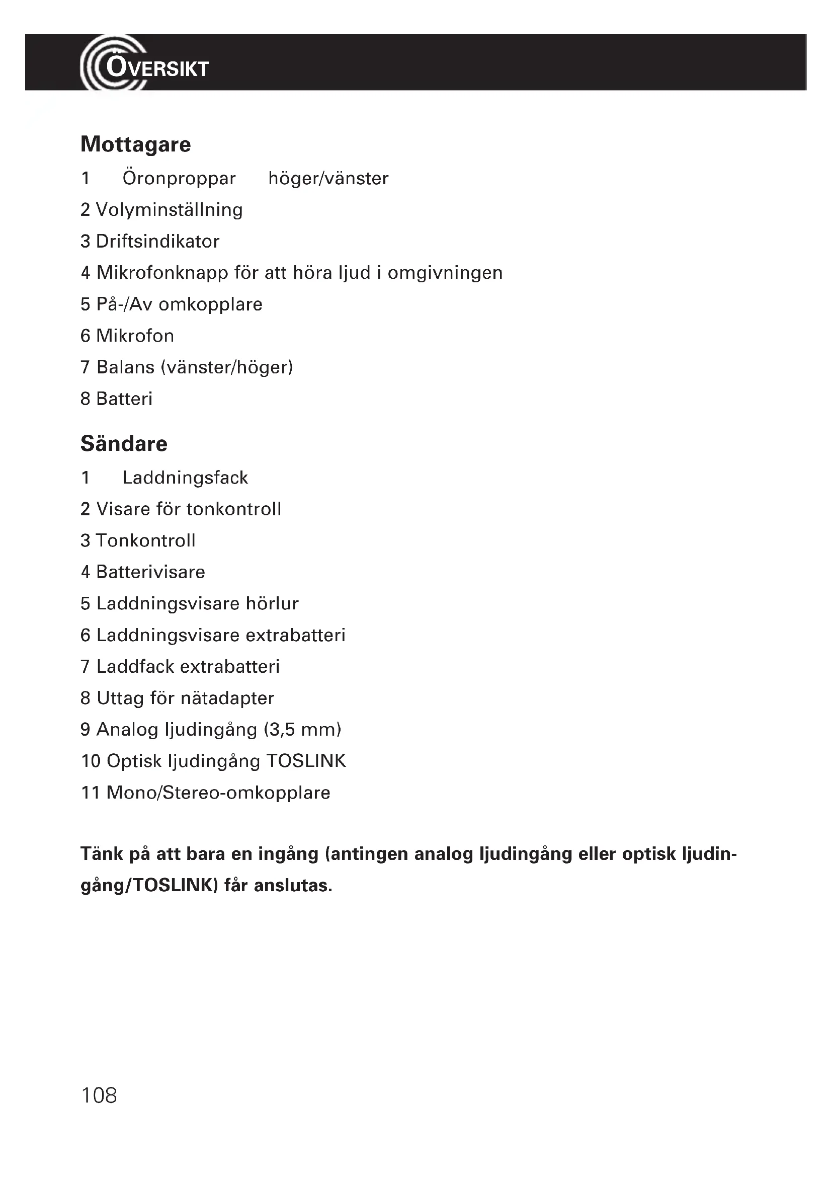 - 1 Bruksanvisning Hur sändaren ansluts 1 Anslut nätadaptern i uttaget på sändarens baksida. 2 Koppla in nätadaptern i ett vägguttag. 3 Anslut sändaren till önskad ljudkälla (t.ex. TV-apparat, stereoanläggning, etc.) För de olika anslutningsmöjligheterna (TV, stereo-anläggning etc.) ingår även flera adaptrar och en mikrofon som kan sättas fast på högta- laren. Tänk på att bara en ingång (antingen analog ljudingång eller optisk lju- dingång/TOSLINK) får anslutas. Den gröna batteri-indikatorn blinkar så snart det finns nät-spänning och lyser med ett konstant sken när ljudkällan är aktiv. Viktigt: Läs först igenom säkerhetsanvisningarna på sidan 120, innan du börjar använda utrustningen.