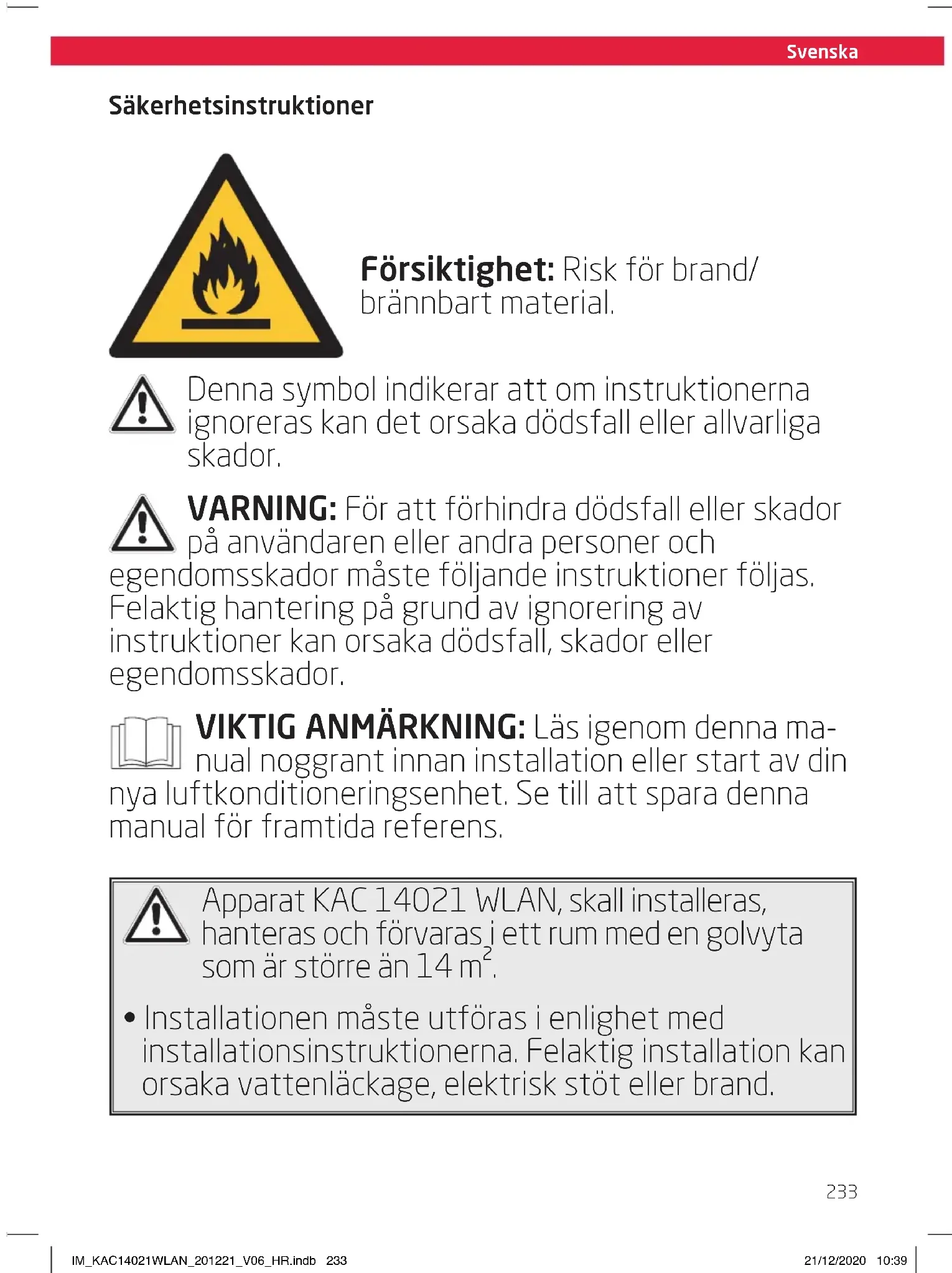 - Installationen måste utföras i enlighet med installationsinstruktionerna. Felaktig installation kan orsaka vattenläckage, elektrisk stöt eller brand. IM_KAC14021WLAN_201221_V06_HR.indb 233IM_KAC14021WLAN_201221_V06_HR.indb 233 21/12/2020 10:3921/12/2020 10:39Svenska