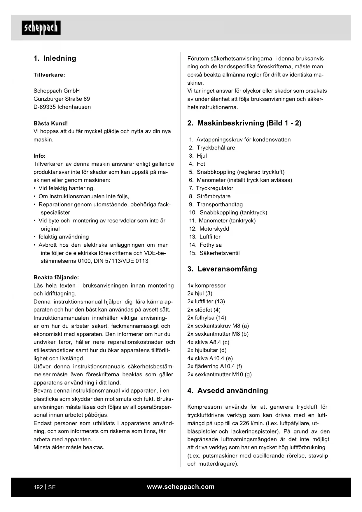 Observera! Vid användning avenna kompressorska foljande principiella sakerhetsatgärder beaktassom skydd mot elektrisk stot, skaderisk och brandfara.Las och beakta dessa anvisningar innan du anvander apparaten.