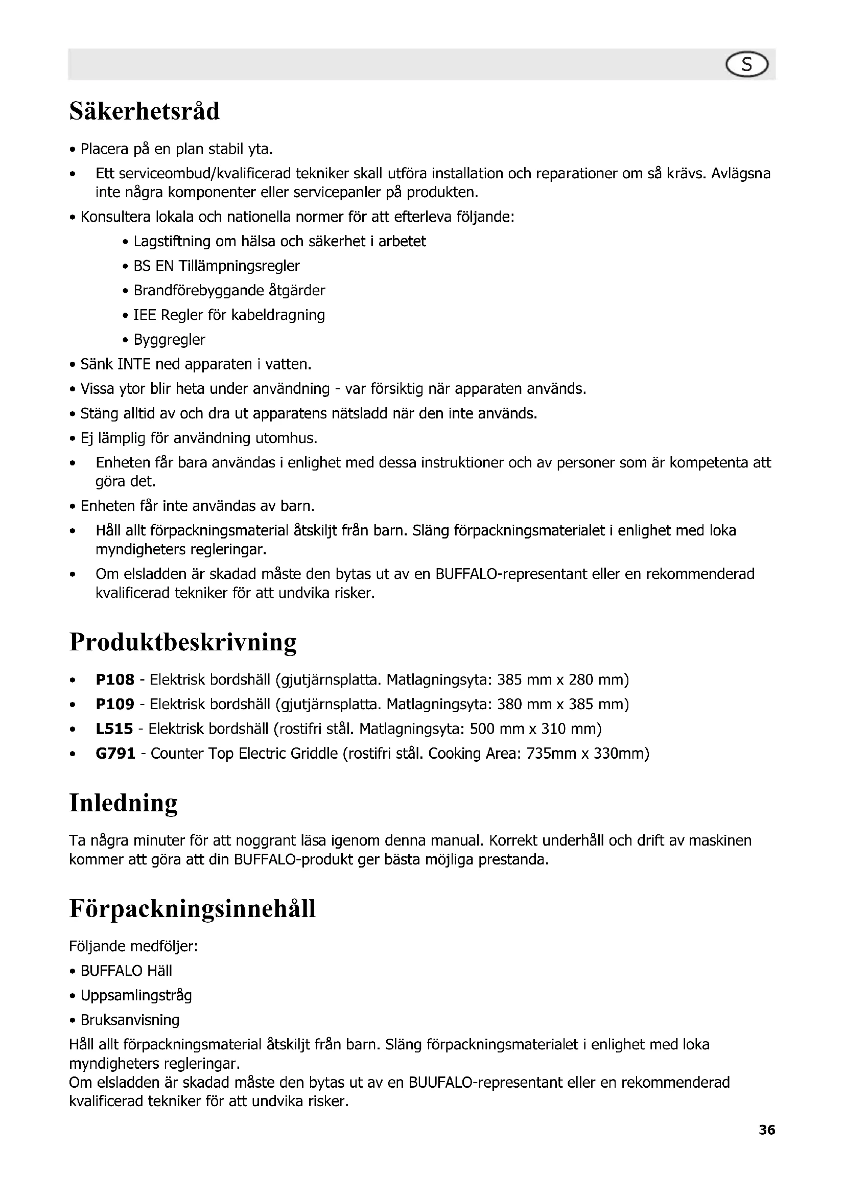 - G791 - Counter Top Electric Griddle (rostifri stål. Cooking Area: 735mm x 330mm) Inledning Ta några minuter för att noggrant läsa igenom denna manual. Korrekt underhåll och drift av maskinen kommer att göra att din BUFFALO-produkt ger bästa möjliga prestanda. Förpackningsinnehåll Följande medföljer: