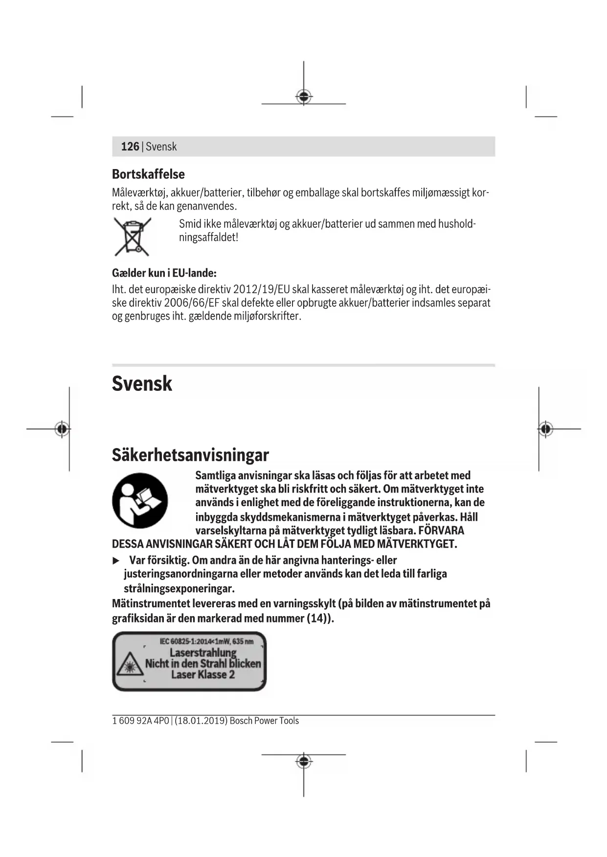 Härmed försäkrar RobertBosch PowerToolsGmbH att denna typ av radioutrust- ning PLR30C/PLR40C överensstämmer med direktiv 2014/53/EU. Den fullstän- diga texten till EU-försäkran om överensstämmelse finns på följande webbadress: no RobertBosch PowerToolsGmbH erklærer herved at radioutstyrstypen PLR30C/ PLR40C er i overensstemmelse med direktivet 2014/53/EU. Den fullstendige teksten i EU-samsvarserklæringen er tilgjengelig på følgende nettadresse: Bosch Power Tools 1 609 92A 4P0 | (18.01.2019)II