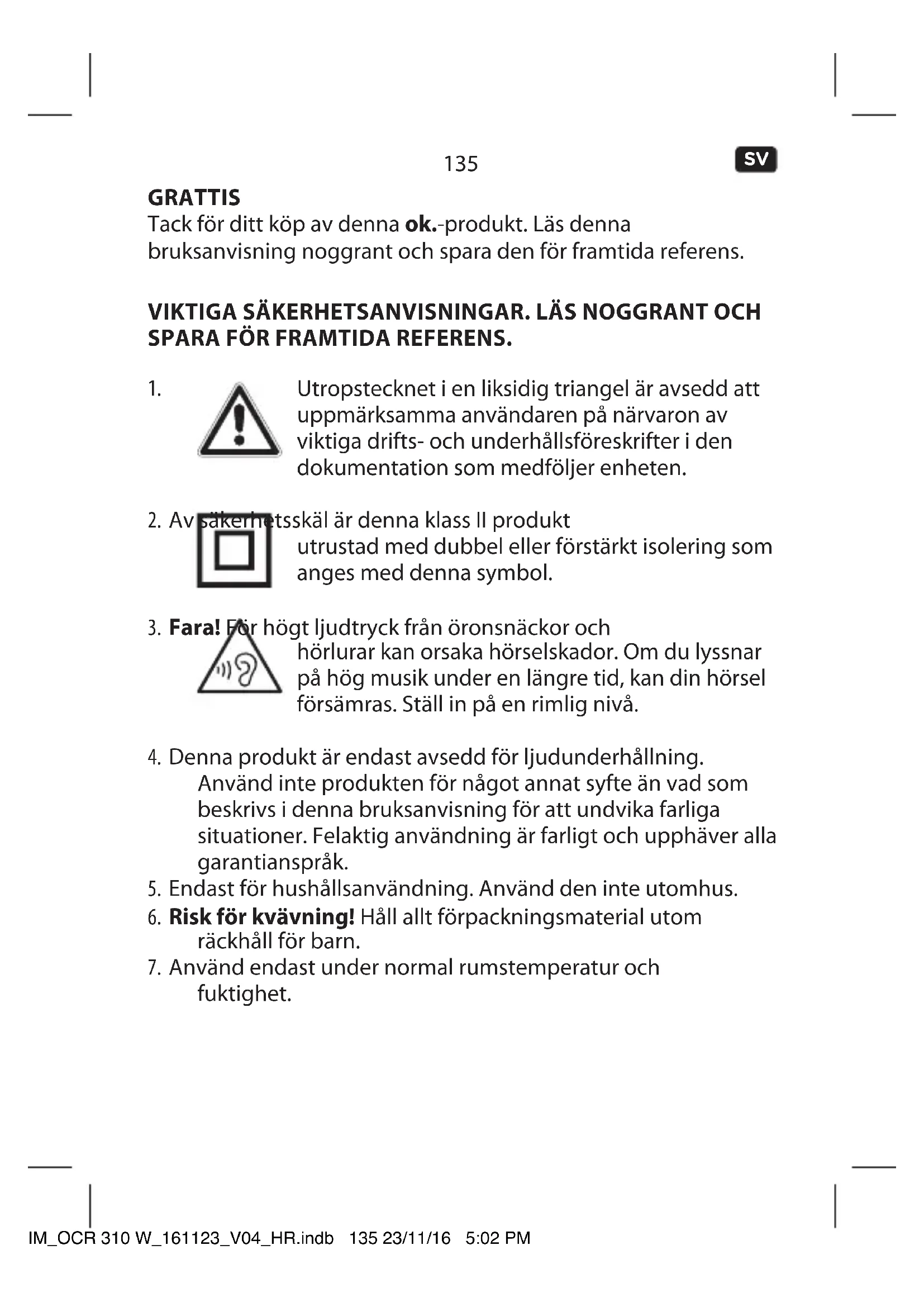 GRATTIS Tack för ditt köp av denna ok.-produkt. Läs denna bruksanvisning noggrant och spara den för framtida referens. VIKTIGA SÄKERHETSANVISNINGAR. LÄS NOGGRANT OCH SPARA FÖR FRAMTIDA REFERENS.
