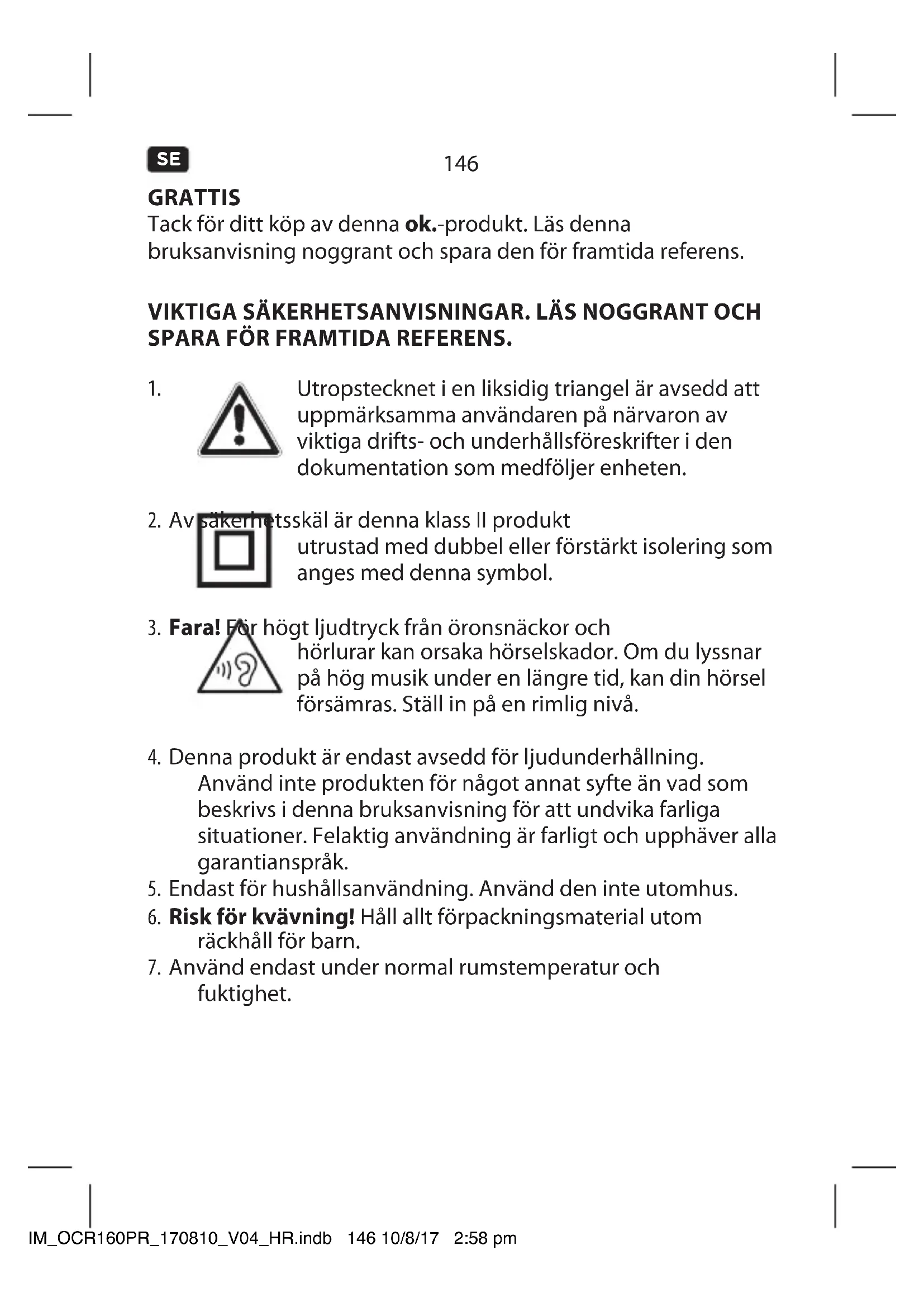 GRATTIS Tack för ditt köp av denna ok.-produkt. Läs denna bruksanvisning noggrant och spara den för framtida referens. VIKTIGA SÄKERHETSANVISNINGAR. LÄS NOGGRANT OCH SPARA FÖR FRAMTIDA REFERENS.