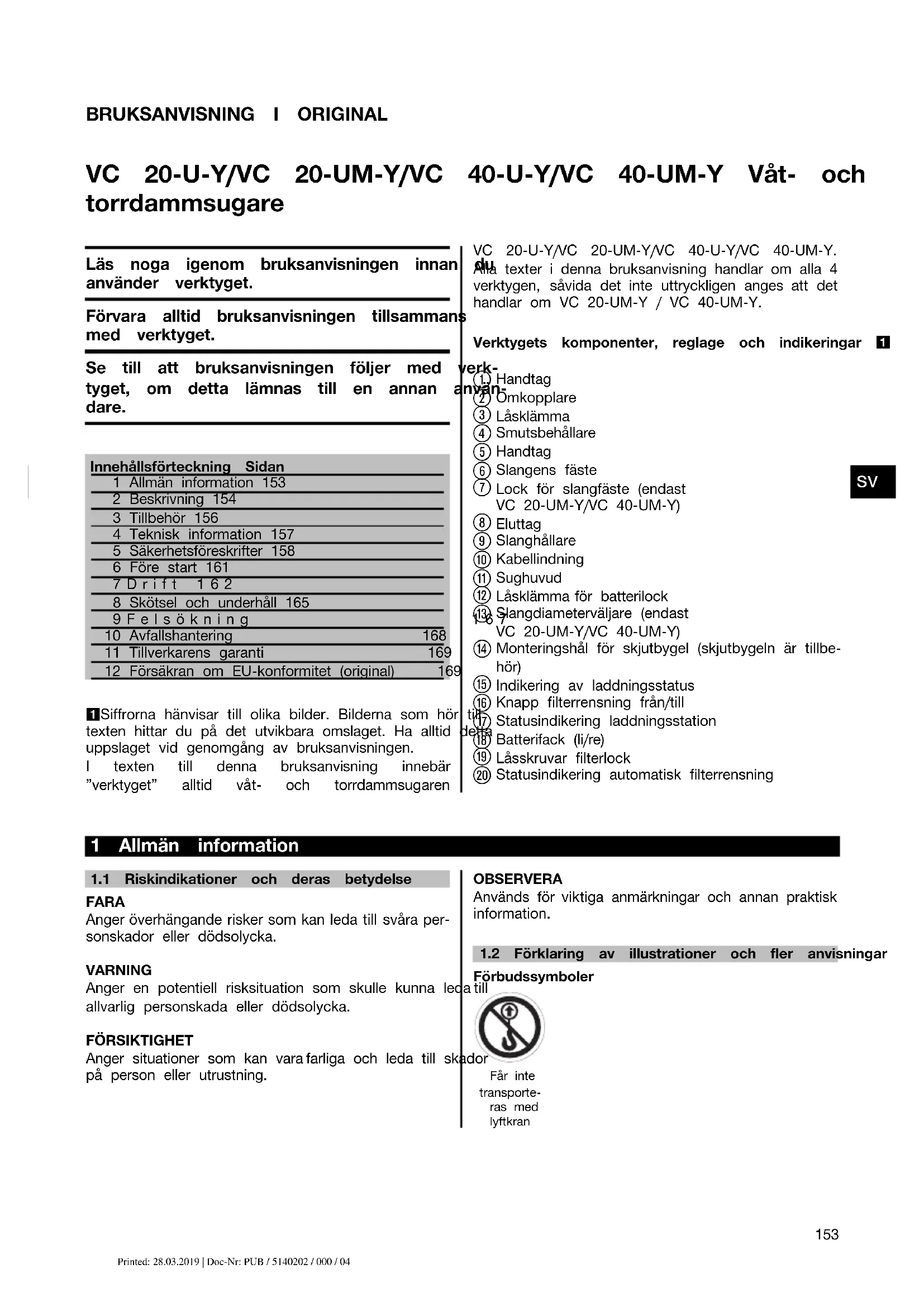 Printed: 24.03.2014 | Doc-Nr: PUB / 5140202 / 000 / 03 Printed: 28.03.2019 | Doc-Nr: PUB / 5140202 / 000 / 04BRUKSANVISNING I ORIGINAL VC 20-U‑Y/VC 20-UM‑Y/VC 40-U‑Y/VC 40-UM‑Y Våt- och torrdammsugare Läs noga igenom bruksanvisningen innan du använder verktyget. Förvara alltid bruksanvisningen tillsammans med verktyget. Se till att bruksanvisningen följer med verk- tyget, om detta lämnas till en annan använ- dare. Innehållsförteckning Sidan1 Allmän information 1532 Beskrivning 1543 Tillbehör 1564 Teknisk information 1575 Säkerhetsföreskrifter 1586 Före start 1617Drift 1628 Skötsel och underhåll 1659Felsökning 16710 Avfallshantering 16811 Tillverkarens garanti 16912 Försäkran om EU-konformitet (original) 1691 Siffrorna hänvisar till olika bilder. Bilderna som hör tilltexten hittar du på det utvikbara omslaget. Ha alltid dettauppslaget vid genomgång av bruksanvisningen. I texten till denna bruksanvisning innebär ”verktyget” alltid våt- och torrdammsugaren VC 20‑U‑Y/VC 20‑UM‑Y/VC 40‑U‑Y/VC 40‑UM‑Y. Alla texter i denna bruksanvisning handlar om alla 4 verktygen, såvida det inte uttryckligen anges att det handlar om VC 20‑UM‑Y / VC 40‑UM‑Y.Verktygets komponenter, reglage och indikeringar 1 Handtag Omkopplare Låsklämma Smutsbehållare Handtag Slangens fäste Lock för slangfäste (endastVC 20‑UM‑Y/VC 40‑UM‑Y) Eluttag Slanghållare Kabellindning Sughuvud Låsklämma för batterilock Slangdiameterväljare (endastVC 20‑UM‑Y/VC 40‑UM‑Y) Monteringshål för skjutbygel (skjutbygeln är tillbe- hör)