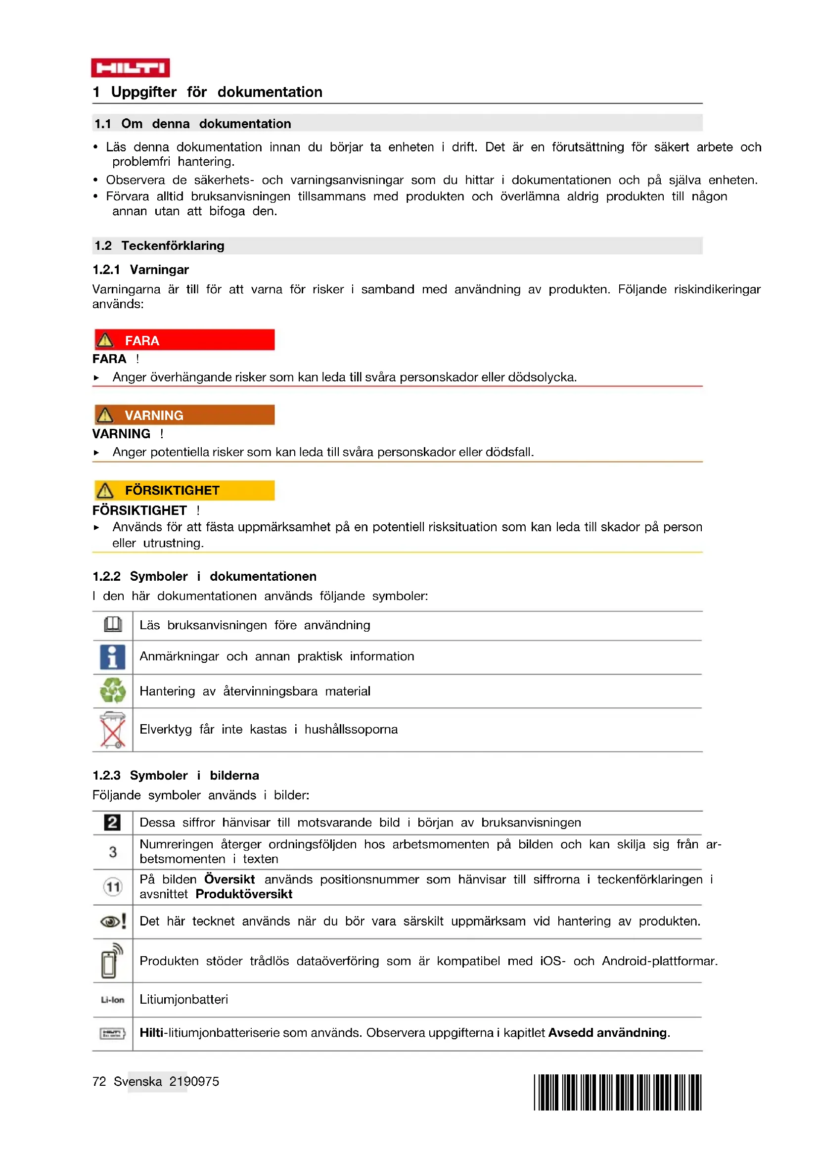 Följande symboler används i bilder: Dessa siffror hänvisar till motsvarande bild i början av bruksanvisningen Numreringen återger ordningsföljden hos arbetsmomenten på bilden och kan skilja sig från ar- betsmomenten i texten På bilden Översikt används positionsnummer som hänvisar till siffrorna i teckenförklaringen i avsnittet Produktöversikt Det här tecknet används när du bör vara särskilt uppmärksam vid hantering av produkten. Produkten stöder trådlös dataöverföring som är kompatibel med iOS- och Android-plattformar. Litiumjonbatteri Hilti-litiumjonbatteriserie som används. Observera uppgifterna i kapitlet Avsedd användning.*2190975* 2190975 Svenska 73 Använd aldrig batteriet som slagverktyg. Låt inte batteriet falla ner på marken. Använd inte batterier som har utsatts för slag eller på annat sätt har skadats.