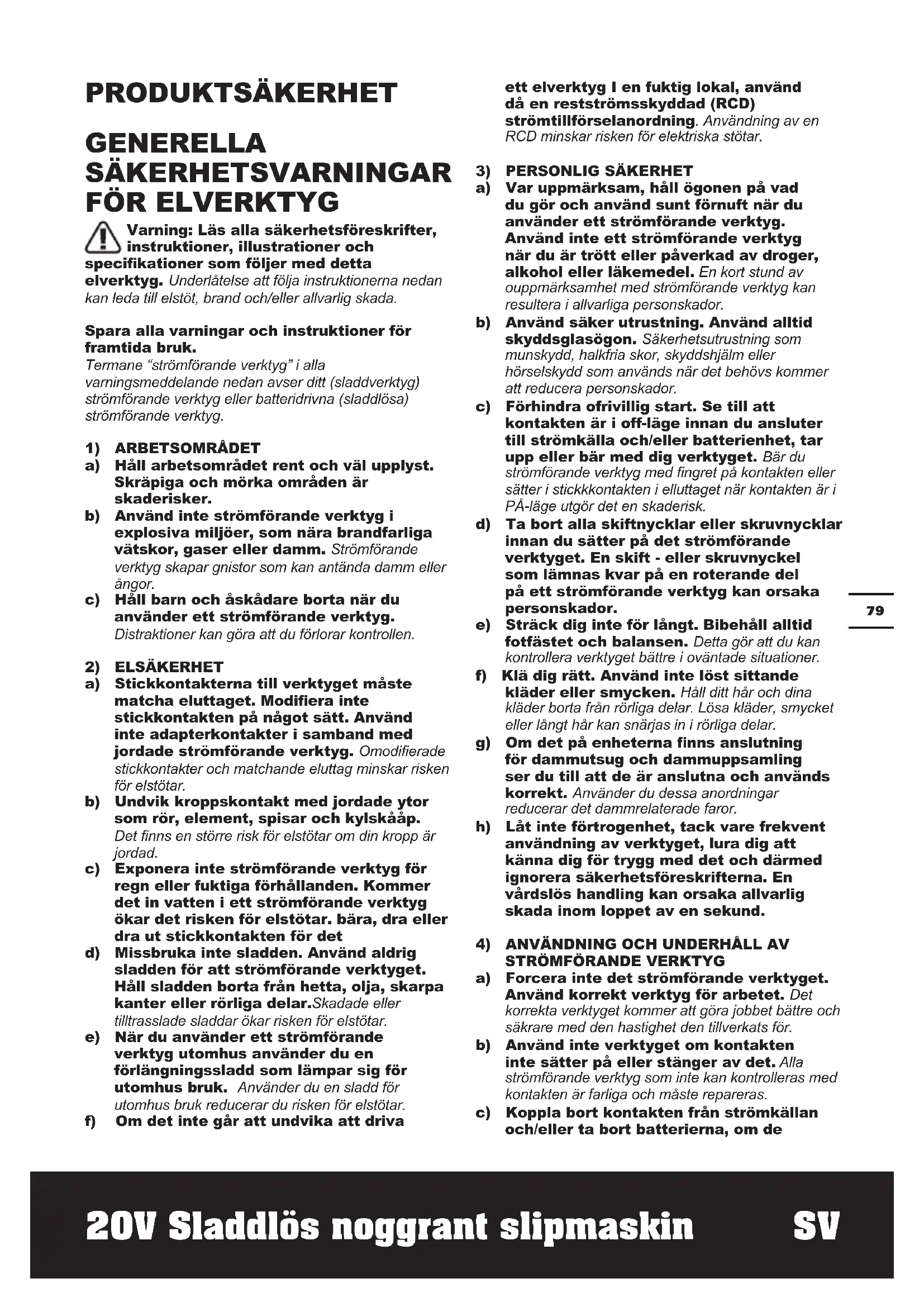 a) Forcera inte det strömförande verktyget. Använd korrekt verktyg för arbetet. Det korrekta verktyget kommer att göra jobbet bättre och säkrare med den hastighet den tillverkats för. b) Använd inte verktyget om kontakten inte sätter på eller stänger av det. Alla strömförande verktyg som inte kan kontrolleras med kontakten är farliga och måste repareras. c) Koppla bort kontakten från strömkällan och/eller ta bort batterierna, om de80 20V Sladdlös noggrant slipmaskin SV är löstagbara, från elverktyget, innan du utför några justeringar, ändrar I tillbehören eller magasinerar elverktygen. Sådana förebyggande säkerhetsåtgärder reducerar risken för att du startar verktyget oavsiktligt. d) Förvara verktyget som inte används utom räckhåll för barn och låt inte någon person använda verktyget som inte känner till verktyget eller dessa anvisningar. Strömförande verktyg är farliga i händerna på outbildade användare. e) Håll koll på elverktyget och tillbehören. Kontrollera inriktningen eller fästet för rörliga delar, defekta delar och alla andra saker som kan påverka användningen av elverktyget. Om den skadats måste elverktyget repareras före användning. Många olyckor orsakas av felaktigt underhållna elverktyg. f) Håll sågverktyget skarpa och rena. Korrekt underhållna skärverktyg med skarpa egg kommer inte att köra fast lika ofta och är enklare att kontrollera. g) Använd elverktyget, tillbehören och verktygsbitsen etc. i enlighet med dessa anvisningar och på det sätt som avsetts för varje typ av elverktyg. Ha också i åtanke arbetsförhållandena och arbetet som skall utföras. Använder du elverktyg för åtgärder som skiljer sig det avsedda arbetet kan det resultera i riskfyllda situationer. h) Håll handtag och greppytor torra, rena och fria från olja och fett. Hala handtag och greppytor ger inte säker hantering och kontroll över verktyget i oväntade situationer.