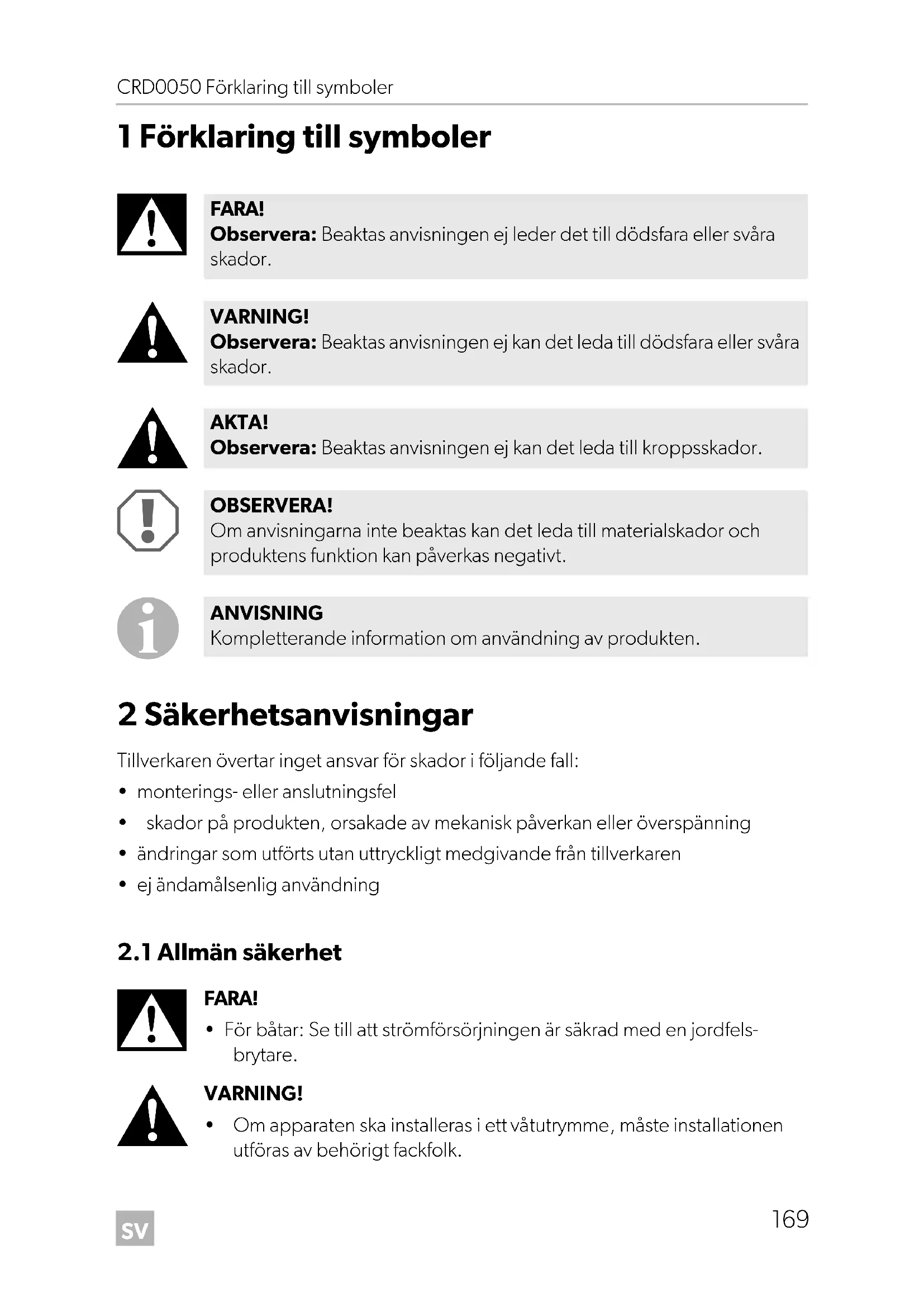 - Om apparaten ska installeras i ett våtutrymme, måste installationen utföras av behörigt fackfolk. FARA! Observera: Beaktas anvisningen ej leder det till dödsfara eller svåra skador. VARNING! Observera: Beaktas anvisningen ej kan det leda till dödsfara eller svåra skador. AKTA! Observera: Beaktas anvisningen ej kan det leda till kroppsskador. OBSERVERA! Om anvisningarna inte beaktas kan det leda till materialskador och produktens funktion kan påverkas negativt. ANVISNING Kompletterande information om användning av produkten. CRD0050--IO-16s.book Seite 169 Mittwoch, 16. August 2017 10:30 10SV Säkerhetsanvisningar CRD0050