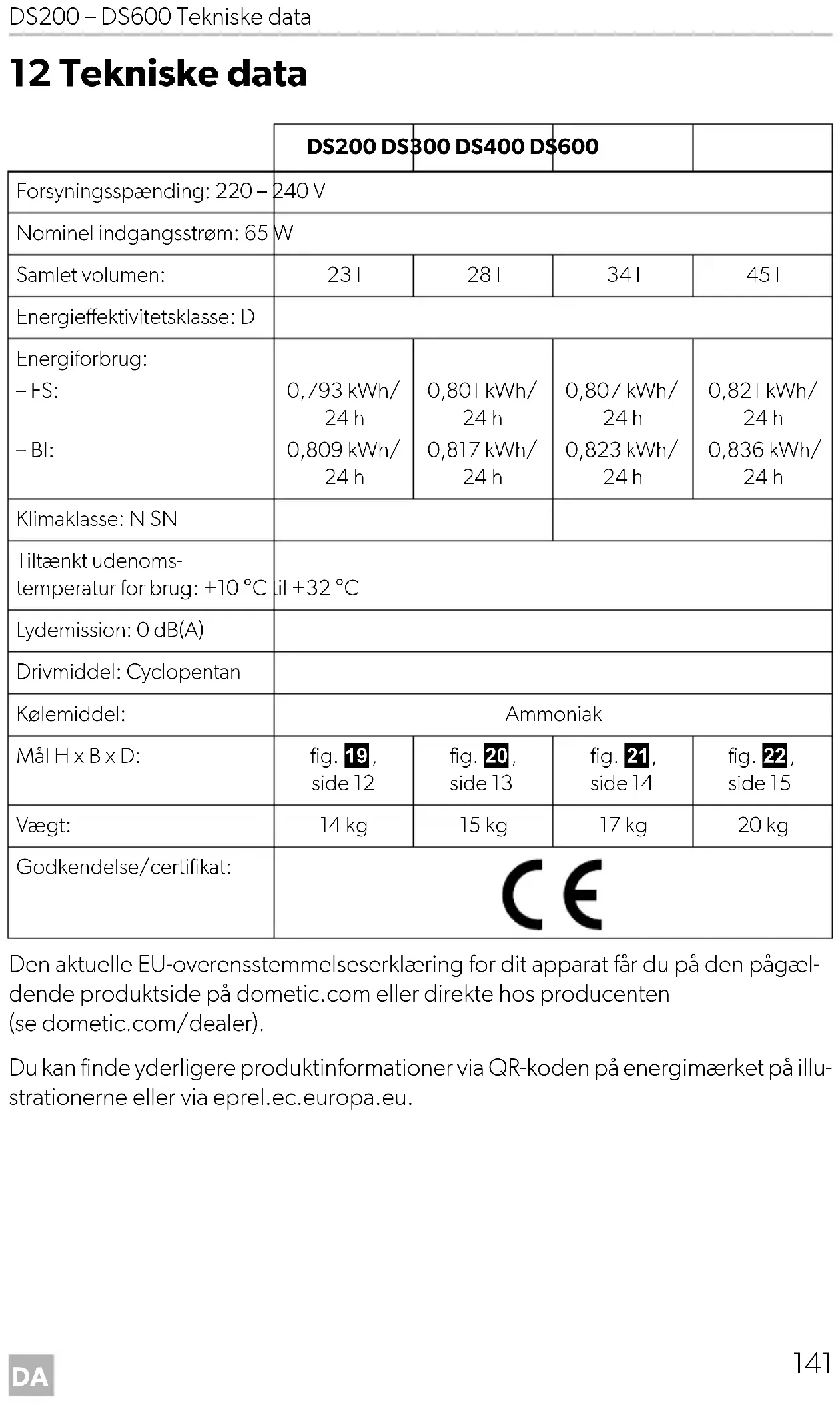 12 Tekniska data Aktuell EU-försäkran om överensstämmelse för maskinen kan erhållas från respektive produktsida på dometic.com eller direkt via tillverkaren (se dometic.com/dealer). Läs in QR-koden på energimärkningen i bilderna för mer information om produkten eller besök eprel.ec.europa.eu. DS200 DS300 DS400 DS600 Försörjningsspänning: 220 – 240 V Nominell ingångsspänning: 65 W Total volym: 23 l 28 l 34 l 45 l Energieffektklass: D Energiförbrukning: – FS: – BI: 0,793 kWh/ 24 h 0,809 kWh/ 24 h 0,801 kWh/ 24 h 0,817 kWh/ 24 h 0,807 kWh/ 24 h 0,823 kWh/ 24 h 0,821 kWh/ 24 h 0,836 kWh/ 24 h Klimatklass: N SN Avsedd användning av omgivningstemperaturen: +10 °C till +32 °C Bulleremission: 0 dB(A) Medium: Cyklopentan Köldmedium: Ammoniak Mått H x B x D: bild i, sida 12 bild j, sida 13 bild k, sida 14 bild l, sida 15 Vikt: 14kg 15kg 17kg 20kg Provning/certifikat: DometicDS200-300-400-600_IOM_4445103315_EMEA16_2020-xx-xx.book Seite 155 Mittwoch, 3. März 2021 11:36 11NO Symbolforklaringer DS200 – DS600