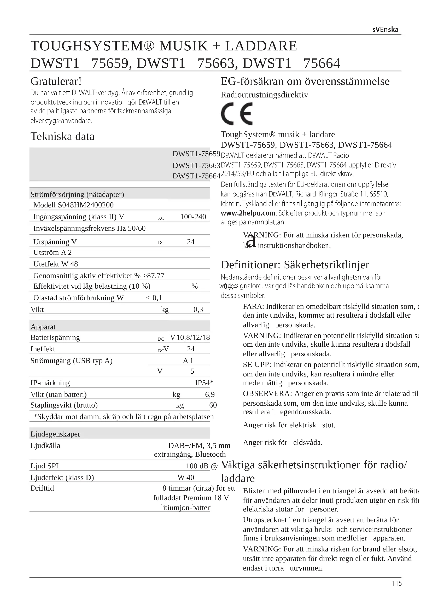 DeWALT deklarerar härmed att DeWALT Radio DWST1-75659, DWST1-75663, DWST1-75664 uppfyller Direktiv 2014/53/EU och alla tillämpliga EU-direktivkrav.Den fullständiga texten för EU-deklarationen om uppfyllelse kan begäras från DeWALT, Richard-Klinger-Straße 11, 65510, Idstein, Tyskland eller finns tillgänglig på följande internetadress: www.2helpu.com. Sök efter produkt och typnummer som anges pånamnplattan.DWST1-75659DWST1-75663DWST1-75664Strömförsörjning (nätadapter)Modell S048HM2400200Ingångsspänning (klass II) V 100-240Inväxelspänningsfrekvens Hz 50/60Utspänning V