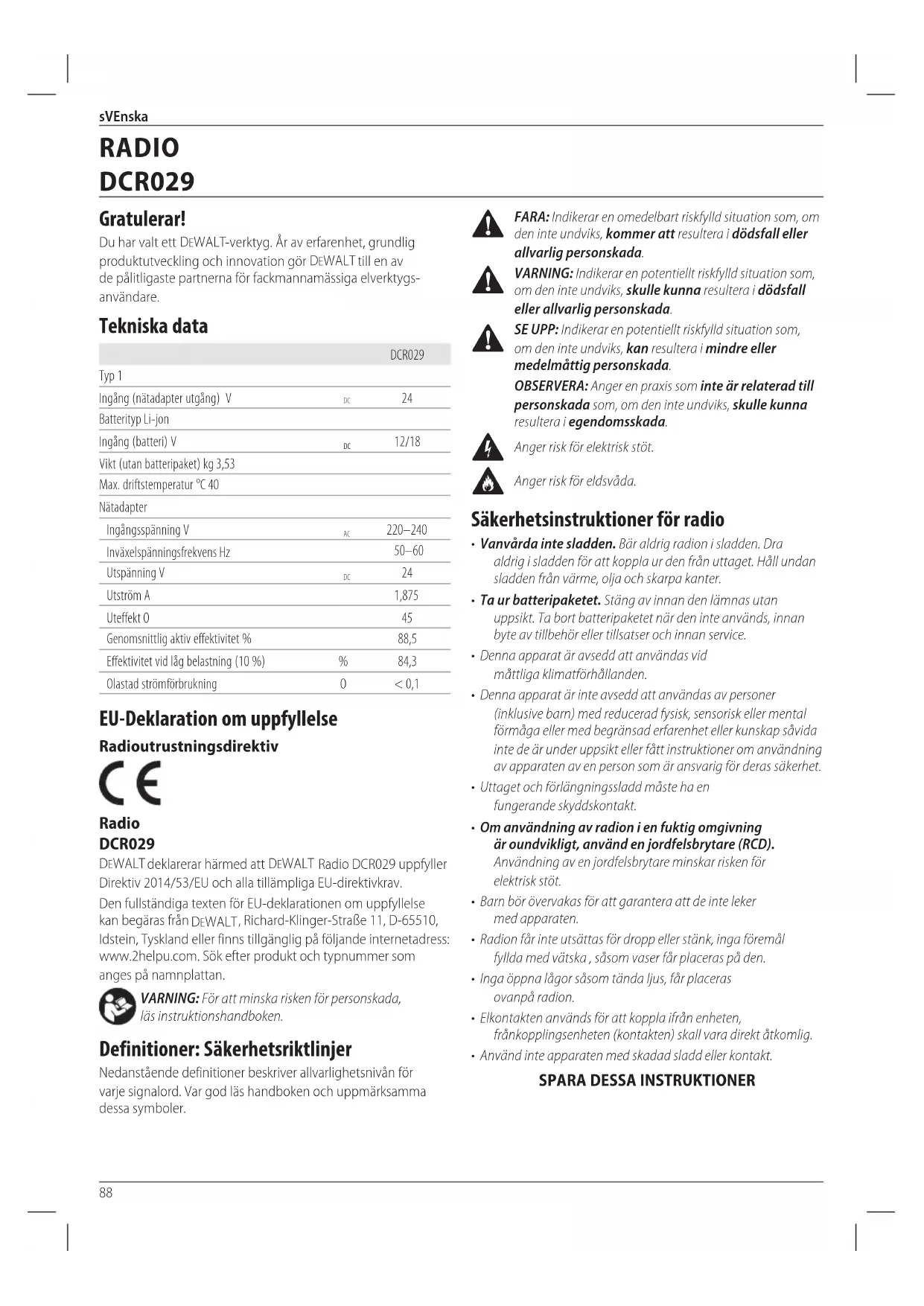 Genomsnittlig aktiv effektivitet % 88,5 Effektivitet vid låg belastning (10 %) % 84,3 Olastad strömförbrukning O < 0,1 EU-Deklaration om uppfyllelse Radioutrustningsdirektiv Radio DCR029 DeWALT deklarerar härmed att DeWALT Radio DCR029 uppfyller Direktiv 2014/53/EU och alla tillämpliga EU-direktivkrav. Den fullständiga texten för EU-deklarationen om uppfyllelse kan begäras från DeWALT , Richard-Klinger-Straße 11, D-65510, Idstein, Tyskland eller finns tillgänglig på följande internetadress: www.2helpu.com. Sök efter produkt och typnummer som anges pånamnplattan. VARNING: För att minska risken för personskada, läsinstruktionshandboken. Definitioner: Säkerhetsriktlinjer Nedanstående definitioner beskriver allvarlighetsnivån för varje signalord. Var god läs handboken och uppmärksamma dessasymboler.