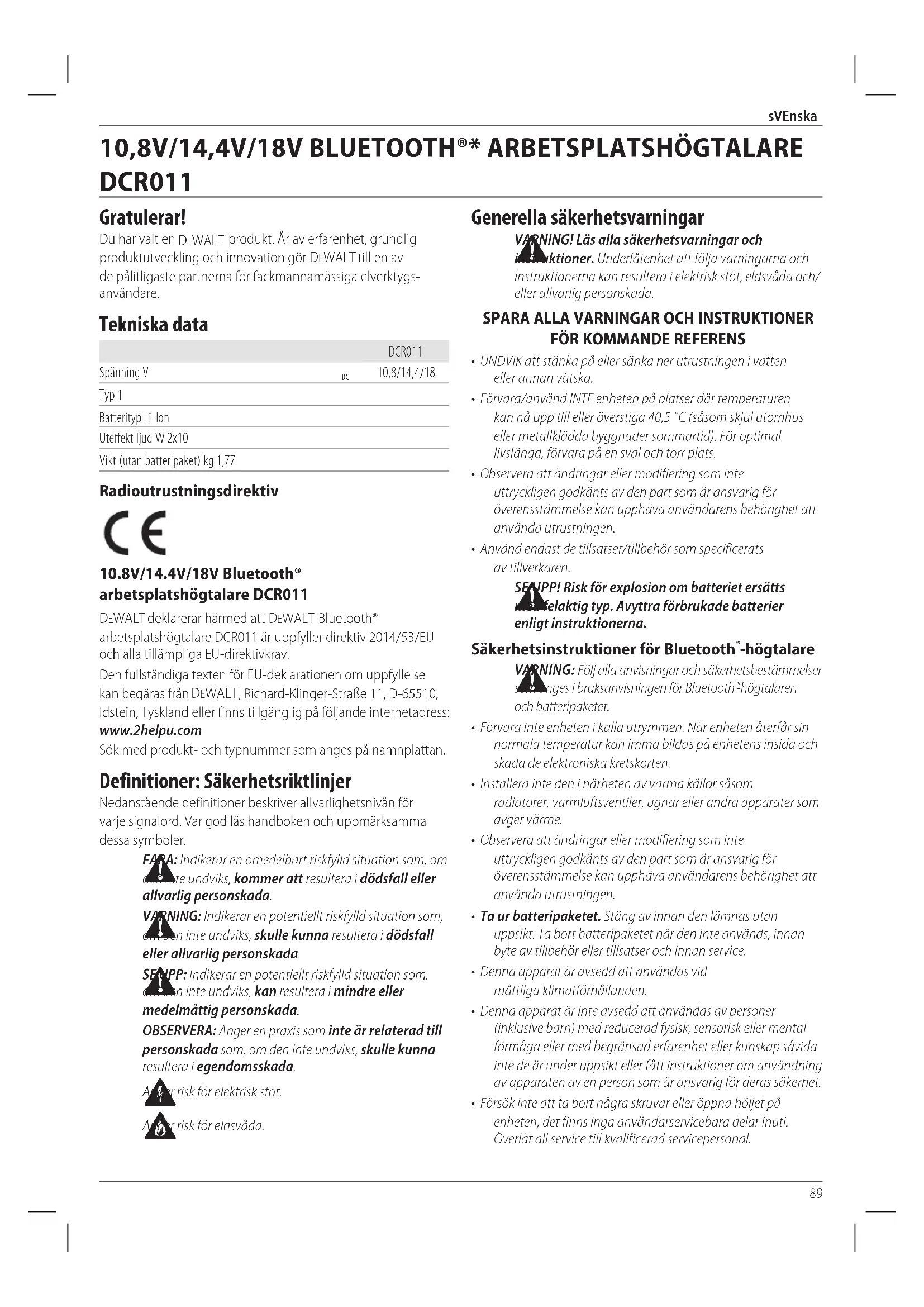 10,8/14,4/18 Typ 1 Batterityp Li-Ion Uteffekt ljud W 2x10 Vikt (utan batteripaket) kg 1,77 Radioutrustningsdirektiv 10.8V/14.4V/18V Bluetooth® arbetsplatshögtalare DCR011 DeWALT deklarerar härmed att DeWALT Bluetooth® arbetsplatshögtalare DCR011 är uppfyller direktiv 2014/53/EU och alla tillämpliga EU-direktivkrav. Den fullständiga texten för EU-deklarationen om uppfyllelse kan begäras från DeWALT , Richard-Klinger-Straße 11, D-65510, Idstein, Tyskland eller finns tillgänglig på följande internetadress: www.2helpu.com Sök med produkt- och typnummer som anges pånamnplattan. Definitioner: Säkerhetsriktlinjer Nedanstående definitioner beskriver allvarlighetsnivån för varje signalord. Var god läs handboken och uppmärksamma dessasymboler.