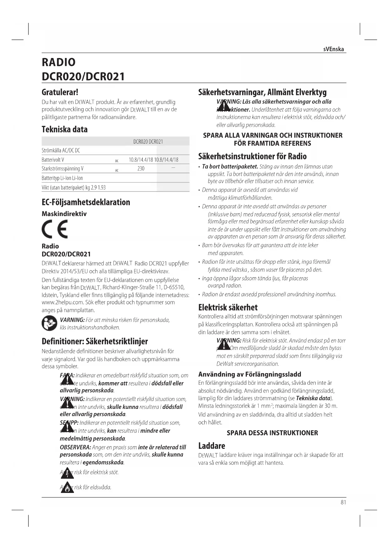 Anger risk föreldsvåda. RADIO DCR020/DCR021 Svenska (översatt från de ursprungliga instruktionerna)82 sVEnska Viktiga Säkerhetsinstruktioner för alla Batteriladdare SPARA DESSA INSTRUKTIONER: Denna manual innehåller viktiga säkerhets- och driftinstruktioner för kompatibla batteriladdare (se tekniska data).