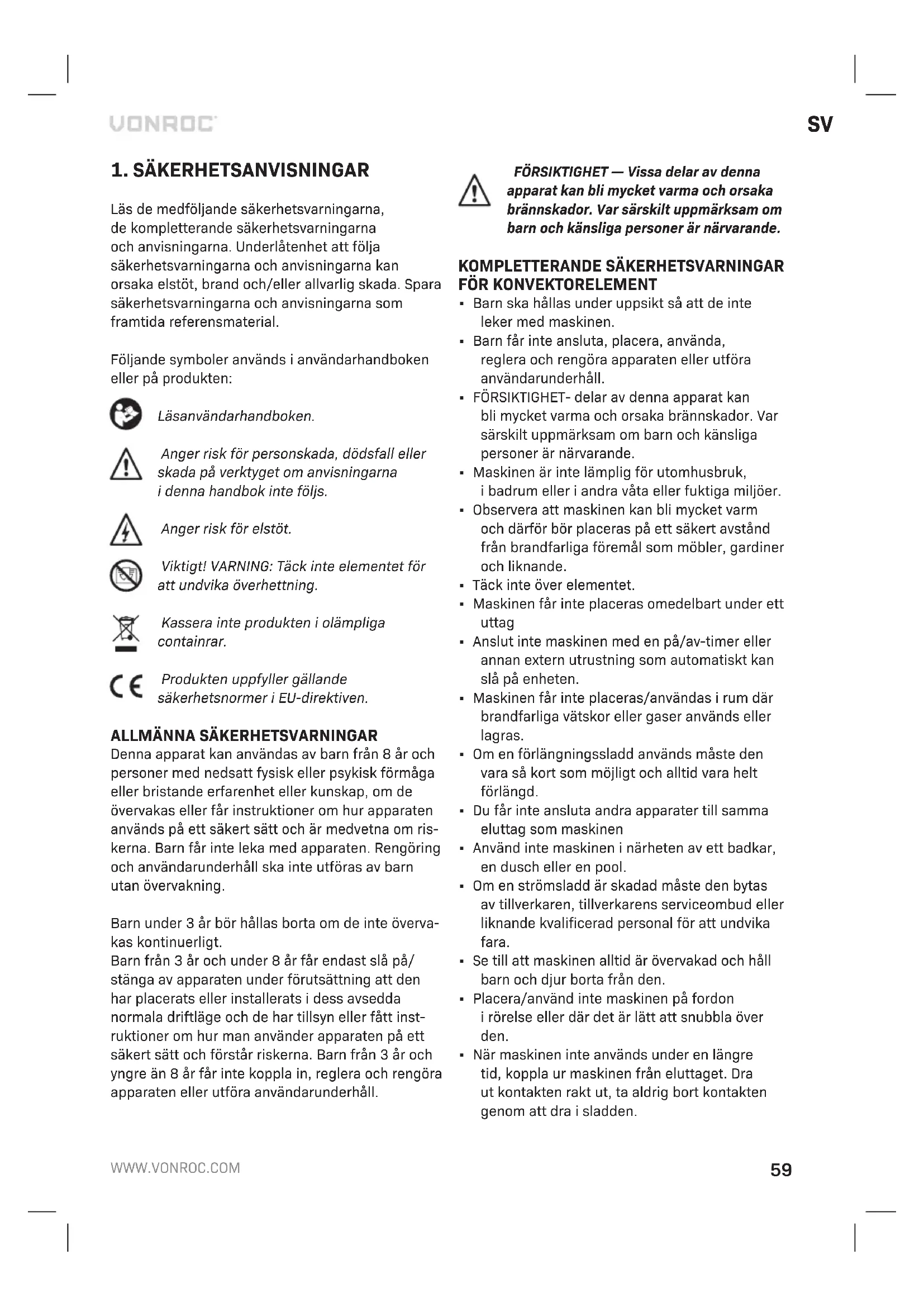 Läs de medföljande säkerhetsvarningarna, de kompletterande säkerhetsvarningarna och anvisningarna. Underlåtenhet att följa säkerhetsvarningarna och anvisningarna kan orsaka elstöt, brand och/eller allvarlig skada. Spara säkerhetsvarningarna och anvisningarna som framtida referensmaterial. Följande symboler används ianvändarhandboken eller på produkten: Läs användarhandboken. Anger risk för personskada, dödsfall eller skada på verktyget om anvisningarna idenna handbok inte följs. Anger risk för elstöt. Viktigt! VARNING: Täck inte elementet för att undvika överhettning. Kassera inte produkten iolämpliga containrar. Produkten uppfyller gällande säkerhetsnormer iEU-direktiven.
