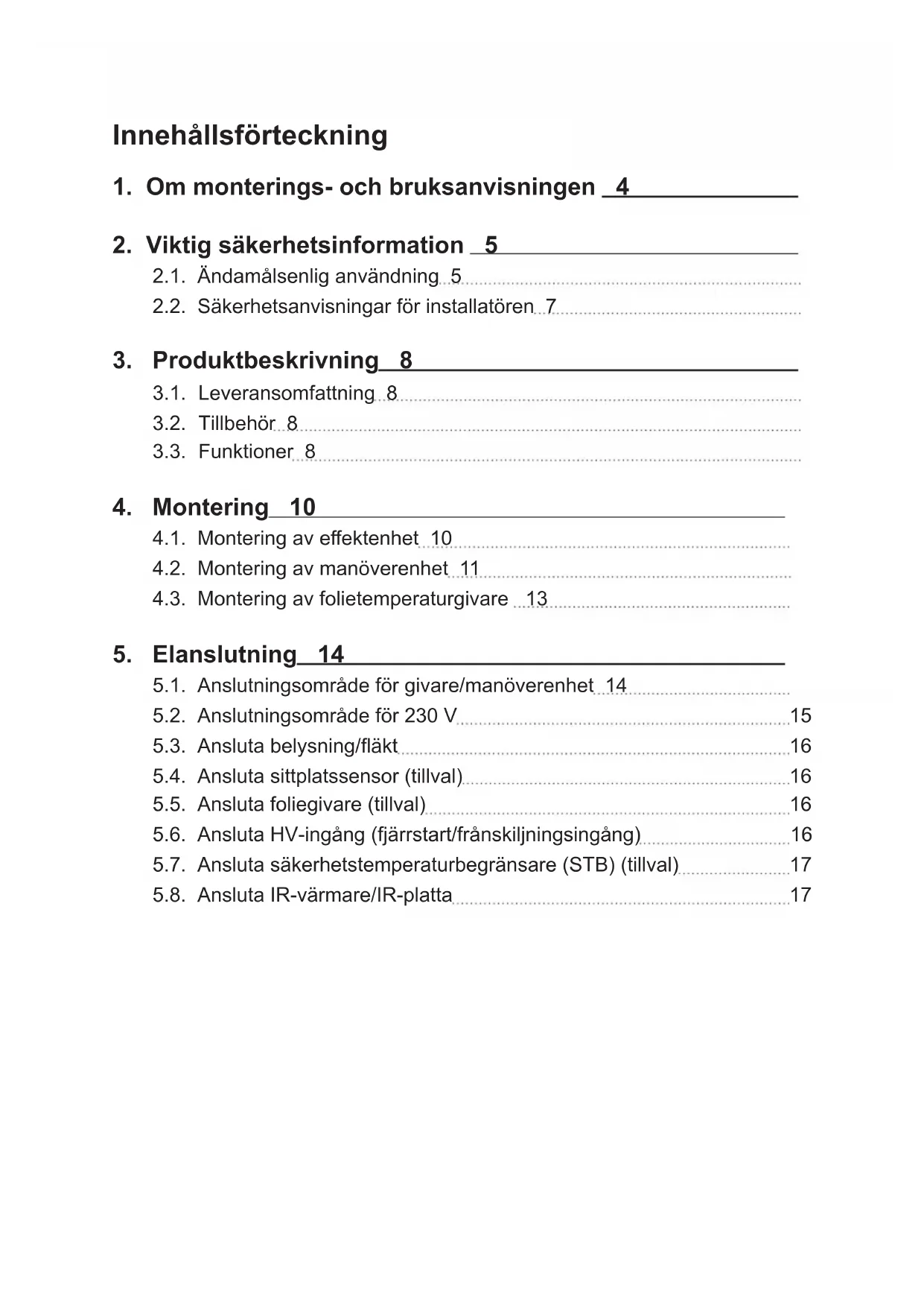 5.1. Anslutningsområde för givare/manöverenhet 14 5.2. Anslutningsområde för 230 V 15 5.3. Ansluta belysning/äkt 16 5.4. Ansluta sittplatssensor (tillval) 16 5.5. Ansluta foliegivare (tillval) 16 5.6. Ansluta HV-ingång (fjärrstart/frånskiljningsingång) 16 5.7. Ansluta säkerhetstemperaturbegränsare (STB) (tillval) 17 5.8. Ansluta IR-värmare/IR-platta 17SV