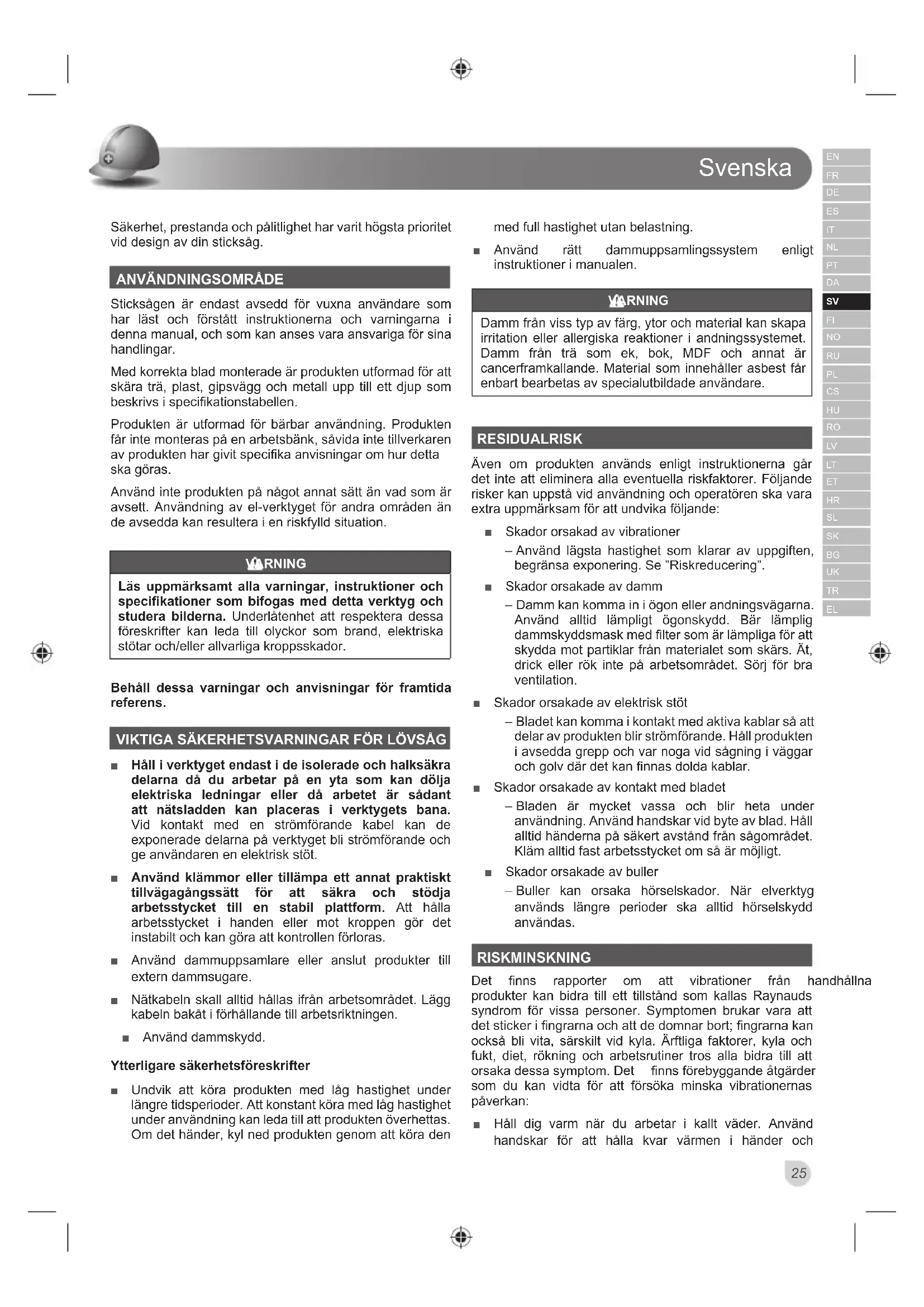 Sticksågen är endast avsedd för vuxna användare som har läst och förstått instruktionerna och varningarna i denna manual, och som kan anses vara ansvariga för sina handlingar. Med korrekta blad monterade är produkten utformad för att skära trä, plast, gipsvägg och metall upp till ett djup som EHVNULYVLVSHFL¿NDWLRQVWDEHOOHQ Produkten är utformad för bärbar användning. Produkten får inte monteras på en arbetsbänk, såvida inte tillverkaren DYSURGXNWHQKDUJLYLWVSHFL¿NDDQYLVQLQJDURPKXUGHWWD ska göras. Använd inte produkten på något annat sätt än vad som är avsett. Användning av el-verktyget för andra områden än de avsedda kan resultera i en riskfylld situation. VARNING Läs uppmärksamt alla varningar, instruktioner och specifikationer som bifogas med detta verktyg och studera bilderna. Underlåtenhet att respektera dessa föreskrifter kan leda till olyckor som brand, elektriska VW|WDURFKHOOHUDOOYDUOLJDNURSSVVNDGRU Behåll dessa varningar och anvisningar för framtida referens. VIKTIGA SÄKERHETSVARNINGAR FÖR LÖVSÅG Ŷ Håll i verktyget endast i de isolerade och halksäkra delarna då du arbetar på en yta som kan dölja elektriska ledningar eller då arbetet är sådant att nätsladden kan placeras i verktygets bana. Vid kontakt med en strömförande kabel kan de exponerade delarna på verktyget bli strömförande och ge användaren en elektrisk stöt. Ŷ Använd klämmor eller tillämpa ett annat praktiskt tillvägagångssätt för att säkra och stödja arbetsstycket till en stabil plattform. Att hålla arbetsstycket i handen eller mot kroppen gör det instabilt och kan göra att kontrollen förloras. Ŷ Använd dammuppsamlare eller anslut produkter till extern dammsugare. Ŷ Nätkabeln skall alltid hållas ifrån arbetsområdet. Lägg kabeln bakåt i förhållande till arbetsriktningen. Ŷ Använd dammskydd. Ytterligare säkerhetsföreskrifter Ŷ Undvik att köra produkten med låg hastighet under längre tidsperioder. Att konstant köra med låg hastighet under användning kan leda till att produkten överhettas. Om det händer, kyl ned produkten genom att köra den med full hastighet utan belastning. Ŷ Använd rätt dammuppsamlingssystem enligt instruktioner i manualen. VARNING Damm från viss typ av färg, ytor och material kan skapa irritation eller allergiska reaktioner i andningssystemet. Damm från trä som ek, bok, MDF och annat är cancerframkallande. Material som innehåller asbest får enbart bearbetas av specialutbildade användare. RESIDUALRISK Även om produkten används enligt instruktionerna går det inte att eliminera alla eventuella riskfaktorer. Följande risker kan uppstå vid användning och operatören ska vara extra uppmärksam för att undvika följande: Ŷ Skador orsakad av vibrationer – Använd lägsta hastighet som klarar av uppgiften, begränsa exponering. Se ”Riskreducering”. Ŷ Skador orsakade av damm – Damm kan komma in i ögon eller andningsvägarna. Använd alltid lämpligt ögonskydd. Bär lämplig dammskyddsmask med filter som är lämpliga för att skydda mot partiklar från materialet som skärs. Ät, drick eller rök inte på arbetsområdet. Sörj för bra ventilation. Ŷ Skador orsakade av elektrisk stöt – Bladet kan komma i kontakt med aktiva kablar så att delar av produkten blir strömförande. Håll produkten i avsedda grepp och var noga vid sågning i väggar och golv där det kan finnas dolda kablar. Ŷ Skador orsakade av kontakt med bladet – Bladen är mycket vassa och blir heta under användning. Använd handskar vid byte av blad. Håll alltid händerna på säkert avstånd från sågområdet. Kläm alltid fast arbetsstycket om så är möjligt. Ŷ Skador orsakade av buller – Buller kan orsaka hörselskador. När elverktyg används längre perioder ska alltid hörselskydd användas. RISKMINSKNING 'HW ¿QQV UDSSRUWHU RP DWW YLEUDWLRQHU IUnQ KDQGKnOOQD produkter kan bidra till ett tillstånd som kallas Raynauds syndrom för vissa personer. Symptomen brukar vara att