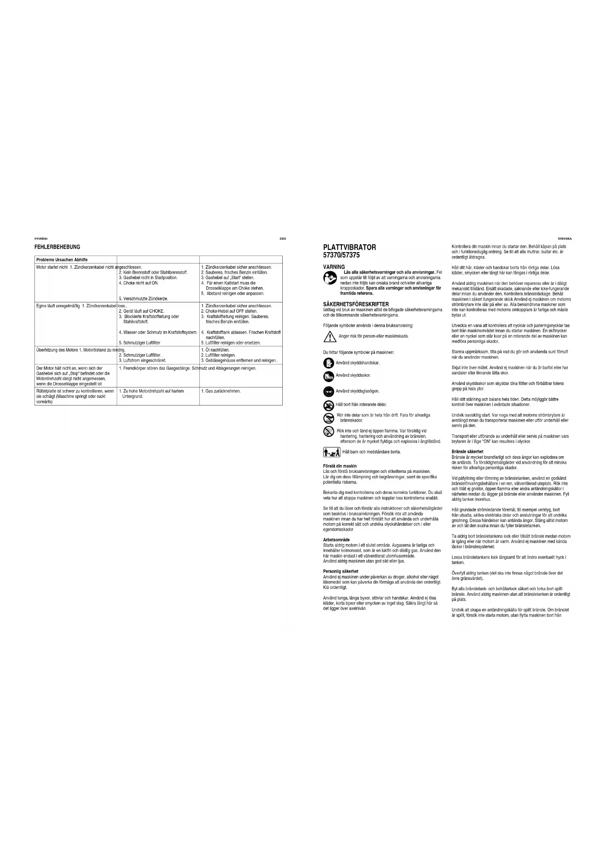PLATTVIBRATOR 57370/57375 VARNING Läs alla säkerhetsvarningar och alla anvisningar. Fel som uppstår till följd av att varningarna och anvisningarna nedan inte följts kan orsaka brand och/eller allvarliga kroppsskador. Spara alla varningar och anvisningar för framtida referens.