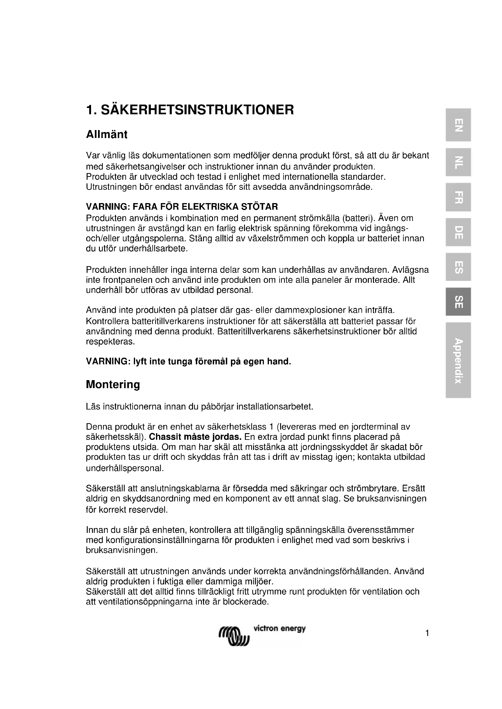 Allmänt Var vänlig läs dokumentationen som medföljer denna produkt först, så att du är bekant med säkerhetsangivelser och instruktioner innan du använder produkten. Produkten är utvecklad och testad i enlighet med internationella standarder. Utrustningen bör endast användas för sitt avsedda användningsområde. VARNING: FARA FÖR ELEKTRISKA STÖTAR Produkten används i kombination med en permanent strömkälla (batteri). Även om utrustningen är avstängd kan en farlig elektrisk spänning förekomma vid ingångs- och/eller utgångspolerna. Stäng alltid av växelströmmen och koppla ur batteriet innan du utför underhållsarbete. Produkten innehåller inga interna delar som kan underhållas av användaren. Avlägsna inte frontpanelen och använd inte produkten om inte alla paneler är monterade. Allt underhåll bör utföras av utbildad personal. Använd inte produkten på platser där gas- eller dammexplosioner kan inträffa. Kontrollera batteritillverkarens instruktioner för att säkerställa att batteriet passar för användning med denna produkt. Batteritillverkarens säkerhetsinstruktioner bör alltid respekteras. VARNING: lyft inte tunga föremål på egen hand. Montering Läs instruktionerna innan du påbörjar installationsarbetet. Denna produkt är en enhet av säkerhetsklass 1 (levereras med en jordterminal av säkerhetsskäl). Chassit måste jordas. En extra jordad punkt finns placerad på produktens utsida. Om man har skäl att misstänka att jordningsskyddet är skadat bör produkten tas ur drift och skyddas från att tas i drift av misstag igen; kontakta utbildad underhållspersonal. Säkerställ att anslutningskablarna är försedda med säkringar och strömbrytare. Ersätt aldrig en skyddsanordning med en komponent av ett annat slag. Se bruksanvisningen för korrekt reservdel. Innan du slår på enheten, kontrollera att tillgänglig spänningskälla överensstämmer med konfigurationsinställningarna för produkten i enlighet med vad som beskrivs i bruksanvisningen. Säkerställ att utrustningen används under korrekta användningsförhållanden. Använd aldrig produkten i fuktiga eller dammiga miljöer. Säkerställ att det alltid finns tillräckligt fritt utrymme runt produkten för ventilation och att ventilationsöppningarna inte är blockerade.2 Installera produkten i en värmeskyddad miljö. Säkerställ därför att det inte finns några kemikalier, plastdelar, gardiner eller andra textilier m.m. i utrustningens omedelbara närhet. Transport och förvaring Vid förvaring eller transport av produkten, säkerställ att batterikablarna är urkopplade. Inget ansvar kommer att accepteras för skador under transport om utrustningen inte transporteras i sin originalförpackning. Förvara produkten i en torr miljö; förvaringstemperaturen bör vara inom intervallet –20°C till 60°C. Se batteritillverkarens bruksanvisning för information om transport, förvaring, laddning, uppladdning och bortskaffning av batteriet.3 EN NL FR DE ES SE Appendix