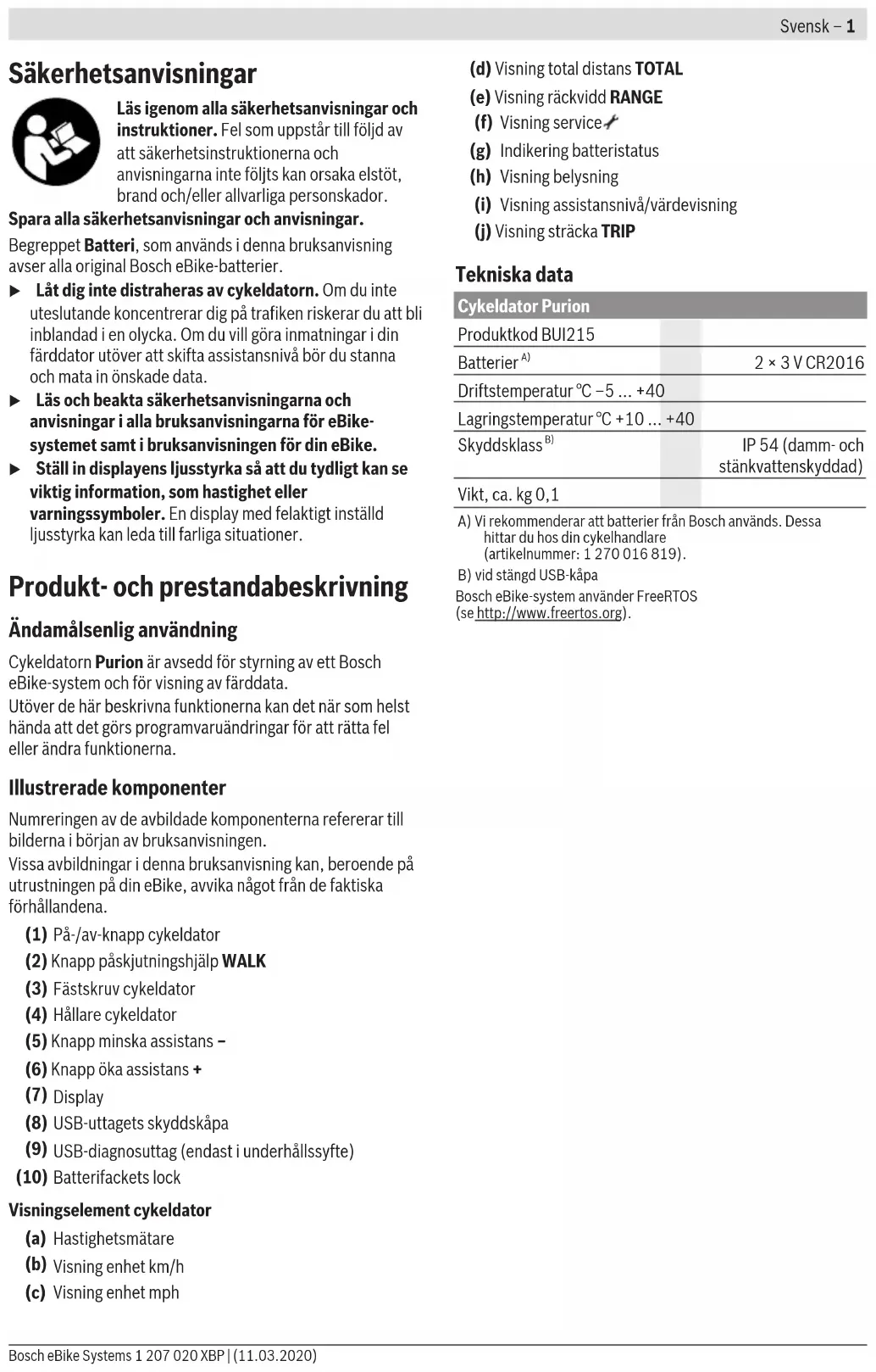 Kommunikationsfejl Genstart systemet. Hvis problemet fortsætter, skal du kontakte Bosch eBike-forhandleren. 889 Intern ABS-fejl Kontakt Bosch eBike-forhandleren. 890 ABS-kontrollampe er defekt eller mangler; ABS er muligvis uden funktion. Kontakt Bosch eBike-forhandleren. Ingen visning Intern fejl i cykelcomputeren Genstart dit eBike-system ved at slukke og tænde igen. Vedligeholdelse og service Vedligeholdelse og rengøring Alle komponenter inklusive drivenheden må ikke dyppes i vand eller rengøres med vand under tryk. Brug en blød klud, der kun er fugtet med vand, til rengøring af din cykelcomputer. Brug ikke rengøringsmiddel. Få udført en teknisk kontrol af dit eBike-system mindst en gang årligt (bl.a. mekanik, systemsoftwarens aktualitet). Desuden kan cykelproducenten eller cykelhandleren lagre et antal kørte kilometer i systemet med henblik på serviceter- minen. I så fald vil cykelcomputeren angive den forfaldne servicetermin med visningen (f) . Ved behov for service eller reparation af eBiken bedes du kontakte en autoriseret cykelhandler. Kundeservice og anvendelsesrådgivning Ved alle spørgsmål til eBike-systemet og dets komponenter bedes du kontakte en autoriseret cykelhandler. Kontaktdata for autoriserede cykelhandlere finder du på hjemmesiden www.bosch-ebike.com. Bortskaffelse Drivenhed, cykelcomputer inkl. betjeningsen- hed, akku, hastighedssensor, tilbehør og em- ballage skal indsamles og genbruges iht. gæl- dende miljøforskrifter. Smid ikke eBikes og deres komponenter ud sammen med husholdningsaffaldet! Iht. det europæiske direktiv 2012/19/EU skal kasseret el-værktøj og iht. det europæiske direktiv 2006/66/EF skal de- fekte eller opbrugte akkuer/batterier indsamles separat og genbruges iht. gældende miljøfor- skrifter. Kasserede Bosch eBike-komponenter bedes afleveret hos en autoriseret cykelhandler. Ret til ændringer forbeholdes. Bosch eBike Systems 1 207 020 XBP | (11.03.2020)Dansk – 8 1 207 020 XBP | (11.03.2020) Bosch eBike SystemsSvensk – 1 Säkerhetsanvisningar Läs igenom alla säkerhetsanvisningar och instruktioner. Fel som uppstår till följd av att säkerhetsinstruktionerna och anvisningarna inte följts kan orsaka elstöt, brand och/eller allvarliga personskador. Spara alla säkerhetsanvisningar och anvisningar. Begreppet Batteri, som används i denna bruksanvisning avser alla original Bosch eBike-batterier. u Låt dig inte distraheras av cykeldatorn. Om du inte uteslutande koncentrerar dig på trafiken riskerar du att bli inblandad i en olycka. Om du vill göra inmatningar i din färddator utöver att skifta assistansnivå bör du stanna och mata in önskade data. u Läs och beakta säkerhetsanvisningarna och anvisningar i alla bruksanvisningarna för eBike- systemet samt i bruksanvisningen för din eBike. u Ställ in displayens ljusstyrka så att du tydligt kan se viktig information, som hastighet eller varningssymboler. En display med felaktigt inställd ljusstyrka kan leda till farliga situationer. Produkt- och prestandabeskrivning Ändamålsenlig användning Cykeldatorn Purion är avsedd för styrning av ett Bosch eBike-system och för visning av färddata. Utöver de här beskrivna funktionerna kan det när som helst hända att det görs programvaruändringar för att rätta fel eller ändra funktionerna. Illustrerade komponenter Numreringen av de avbildade komponenterna refererar till bilderna i början av bruksanvisningen. Vissa avbildningar i denna bruksanvisning kan, beroende på utrustningen på din eBike, avvika något från de faktiska förhållandena. (1) På-/av-knapp cykeldator (2) Knapp påskjutningshjälp WALK (3) Fästskruv cykeldator (4) Hållare cykeldator (5) Knapp minska assistans – (6) Knapp öka assistans + (7) Display (8) USB-uttagets skyddskåpa (9) USB-diagnosuttag (endast i underhållssyfte) (10) Batterifackets lock Visningselement cykeldator (a) Hastighetsmätare (b) Visning enhet km/h (c) Visning enhet mph (d) Visning total distans TOTAL (e) Visning räckvidd RANGE (f) Visning service (g) Indikering batteristatus (h) Visning belysning (i) Visning assistansnivå/värdevisning (j) Visning sträcka TRIP Tekniska data Cykeldator Purion Produktkod BUI215 Batterier