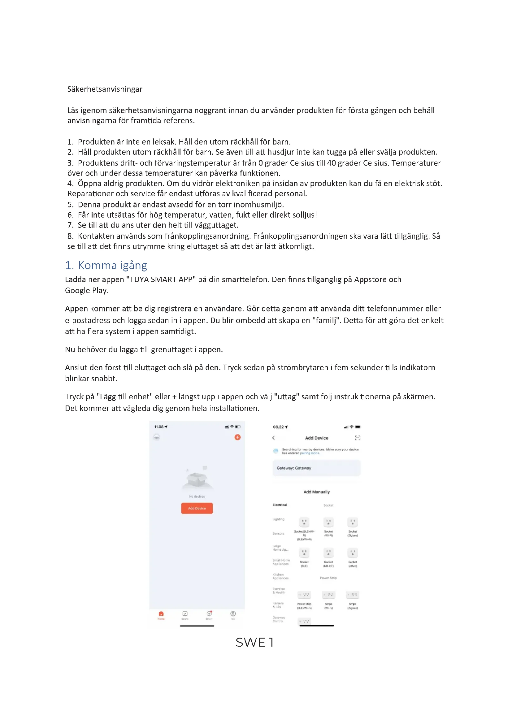 Ladda ner appen "TUYASMARTAPP" på din smarelefon. Den finns llgänglig på Appstore och Google Play. Appen kommer a be dig registrera en användare. Gör dea genom a använda di telefonnummer eller e-postadress och logga sedan in i appen. Du blir ombedd a skapa en "familj". Dea för a göra det enkelt a ha flera system i appen samdigt. Nu behöver du lägga ll grenuaget i appen. Anslut den först ll eluaget och slå på den. Tryck sedan på strömbrytaren i fem sekunder lls indikatorn blinkar snabbt. Tryck på "Lägg ll enhet" eller + längst upp i appen och välj "uag" samt följ instruk onerna på skärmen. Det kommer a vägleda dig genom hela installaonen.