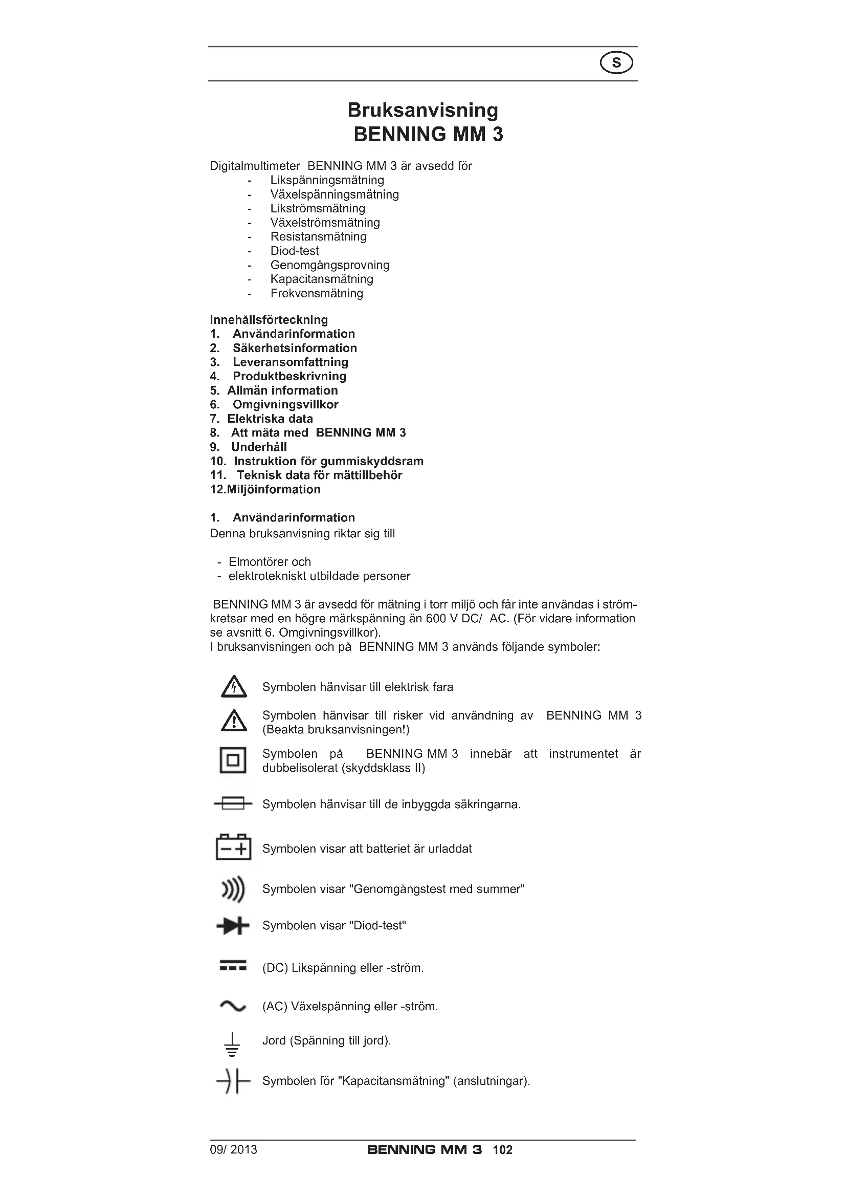 Denna bruksanvisning riktar sig till - Elmontörer och - elektrotekniskt utbildade personer BENNING MM 3 är avsedd för mätning i torr miljö och får inte användas i ström- kretsar med en högre märkspänning än 600 V DC/ AC. (För vidare information se avsnitt 6. Omgivningsvillkor). I bruksanvisningen och på BENNING MM 3 används följande symboler: