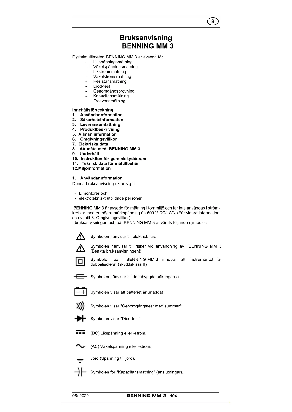Denna bruksanvisning riktar sig till - Elmontörer och - elektrotekniskt utbildade personer BENNING MM 3 är avsedd för mätning i torr miljö och får inte användas i ström- kretsar med en högre märkspänning än 600 V DC/ AC. (För vidare information se avsnitt 6. Omgivningsvillkor). I bruksanvisningen och på BENNING MM 3 används följande symboler: