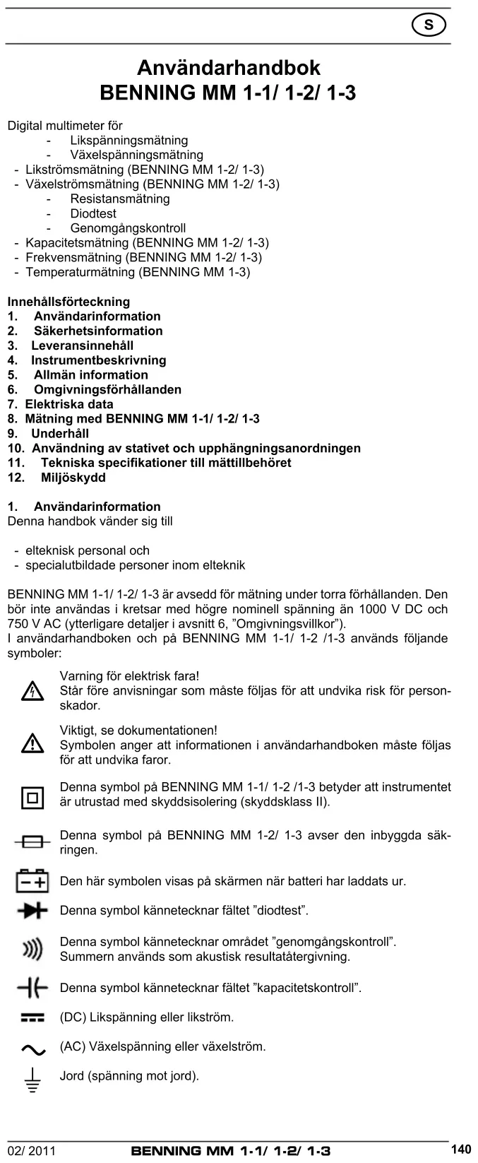 Denna handbok vänder sig till - elteknisk personal och - specialutbildade personer inom elteknik BENNING MM 1-1/ 1-2/ 1-3 är avsedd för mätning under torra förhållanden. Den bör inte användas i kretsar med högre nominell spänning än 1000 V DC och 750 V AC (ytterligare detaljer i avsnitt 6, ”Omgivningsvillkor”). I användarhandboken och på BENNING MM 1-1/ 1-2 /1-3 används följande symboler: