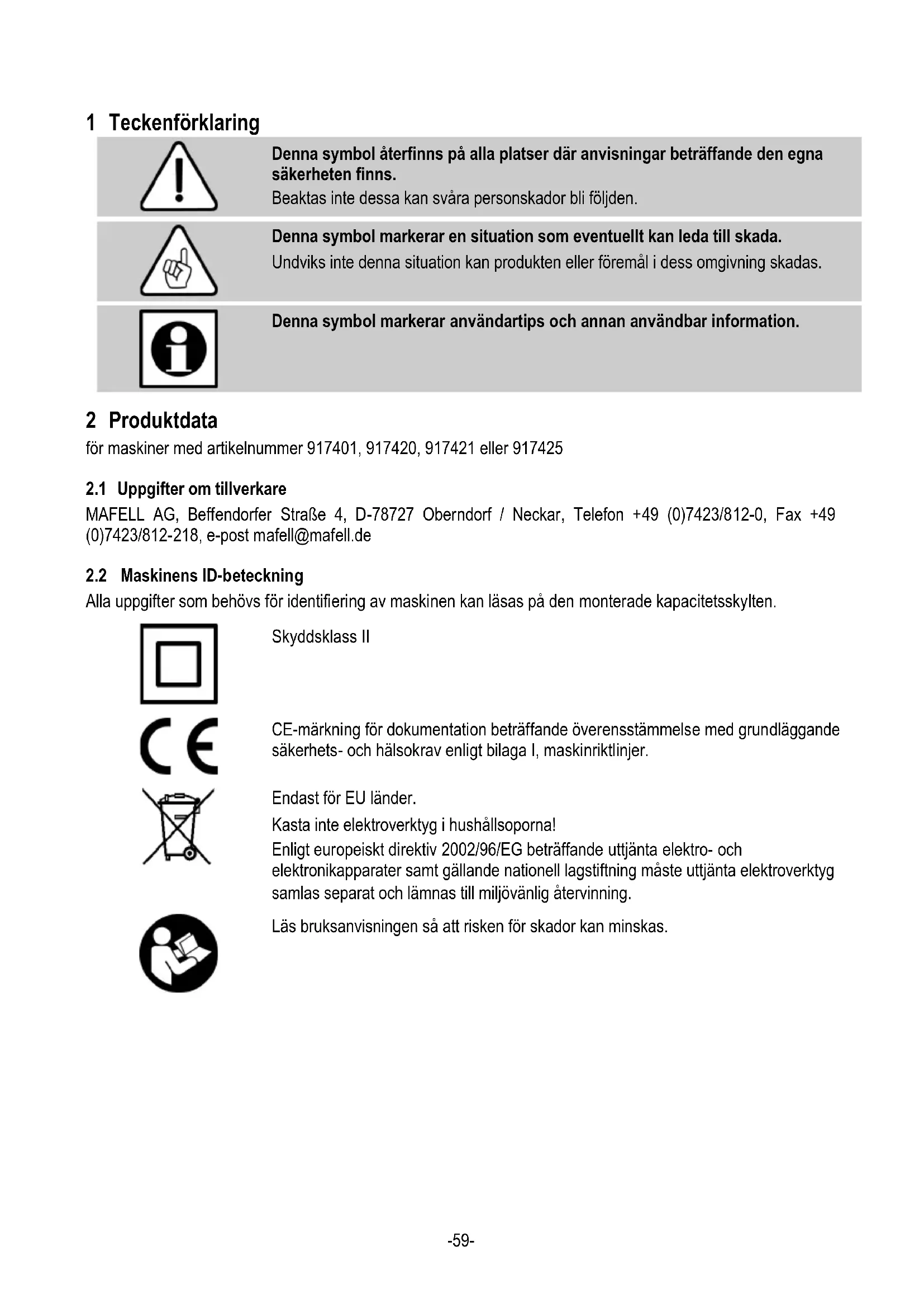 Denna symbol markerar användartips och annan användbar information. 2 Produktdata för maskiner med artikelnummer 917401, 917420, 917421 eller 917425