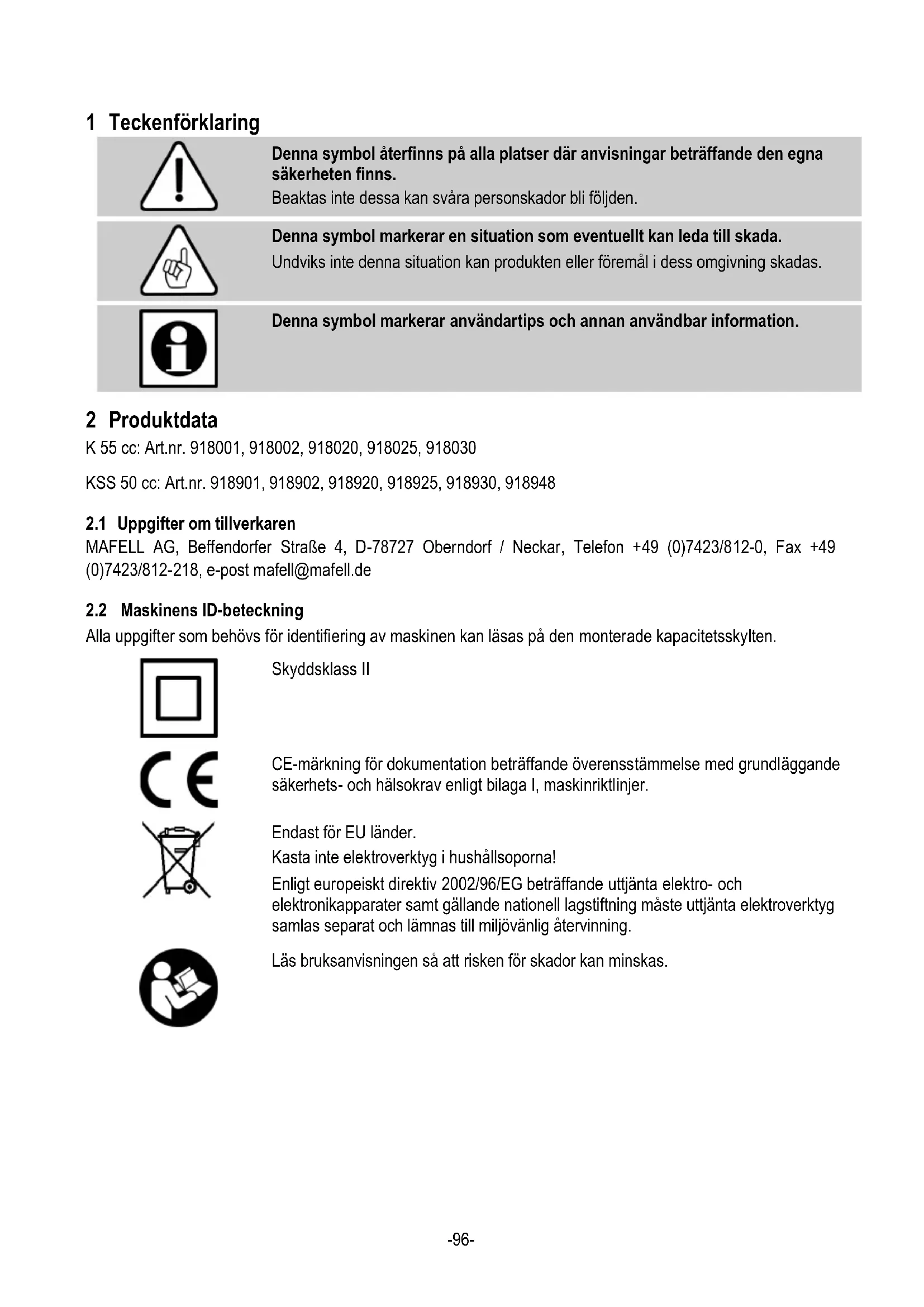 Denna symbol återfinns på alla platser där anvisningar beträffande den egna säkerheten finns. Beaktas inte dessa kan svåra personskador bli följden.