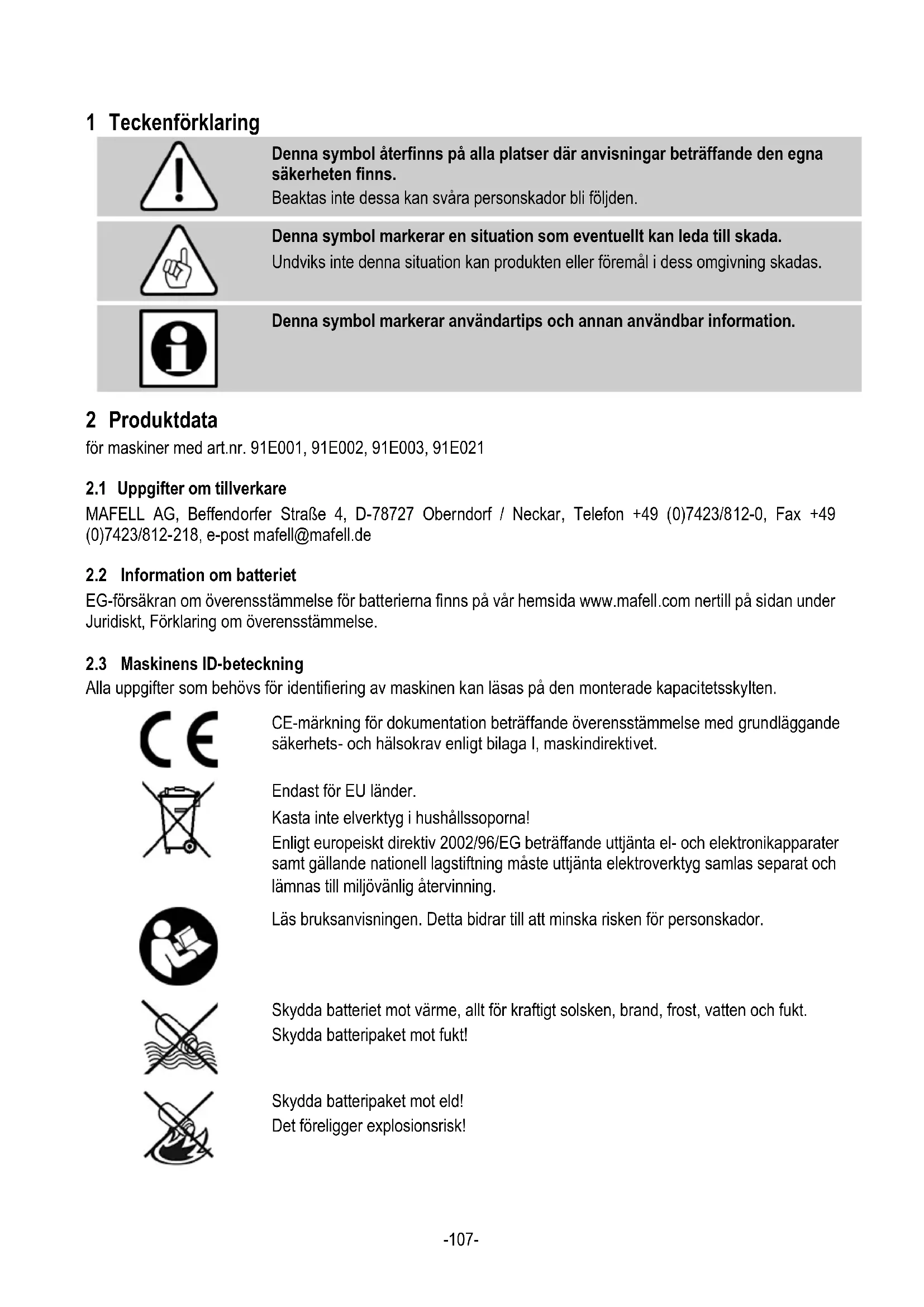 Denna symbol markerar användartips och annan användbar information. 2 Produktdata för maskiner med art.nr. 91E001, 91E002, 91E003, 91E021