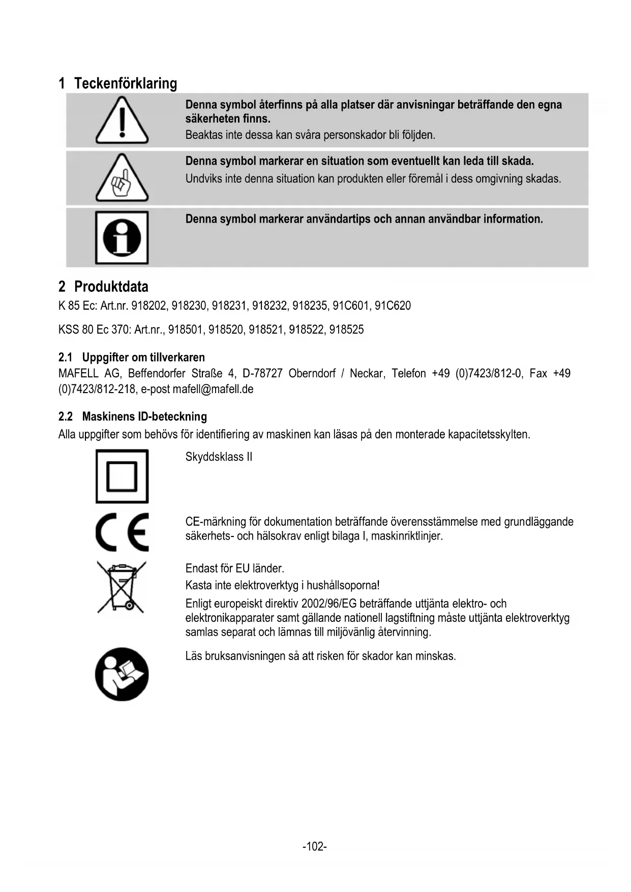K 85 Ec / KSS 80 Ec är endast avsedd för längd- och tvärkapning av massivt trä. Även träbaserat material som spånplattor, lamellträ och MDF-skivor kan bearbetas. Använd godkända sågklingor enligt EN 847-1. Också möjlig för bearbetning av träfiberisoleringsmaterial och plast (Styropor) är. En annan användning än vad som beskrivs ovan är inte tillåten. Tillverkaren frånsäger sig allt ansvar för skador som kan härledas till sådan avvikande användning. Följ de riktlinjer beträffande användning, service och underhåll som lämnas av MAFELL för korrekt användning av maskinen.