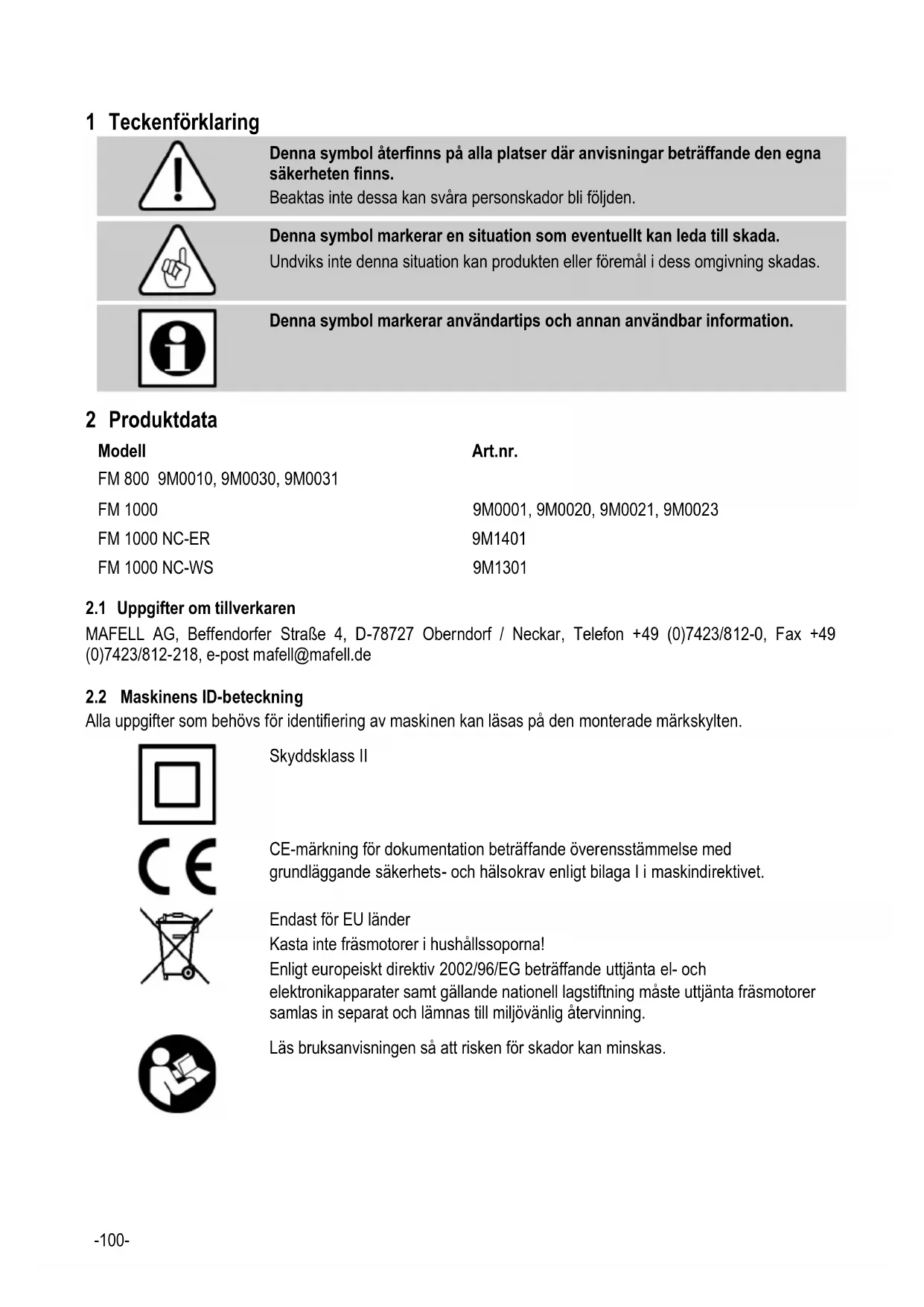 Risk Beakta alltid följande säkerhetshänvisningar och de säkerhetsbestämmelser som gäller i repsektive användarland! Allmänna anvisningar: - Barn och ungdomar får inte hantera denna maskin. Detta gäller dock inte ungdomar som arbetar under uppsikt av fackman inom ramen för sin utbildning. - Arbeta aldrig utan de för respektive arbetsmoment föreskrivna skyddsanordningarna på portalsystemet i vilket fräsmotorn sätts in. Ändra inget på portalsystemet eller på fräsmotorn, vilket skulle kunna påverka säkerheten. - Skadad kabel eller kontakt måste omgående bytas ut. För att undvika säkerhetsrisker får bytet endast utföras av MAFELL eller av en auktoriserad MAFELL-kundtjänstverkstad. - Förhindra skarpa böjningar av kabeln. Linda inte kabeln runt fräsmotorn vid transport och förvaring av fräsmotorn. - Användning med vatten eller ledande vätskor är förbjuden. - Fräsmotorn får inte användas som handhållen fräsmotor. - Håll fräsmotorn borta från regn eller fukt. Vatten som tränger in i fräsmotorn ökar risken för en elektrisk stöt. Följande får inte användas: - Skadade verktyg med sprickor och sådana med förändrad form. - Trubbiga verktyg p.g.a. den alltför höga motorbelastningen. - Verktyg som inte är lämpliga för tomgångsvarvtalet för fräsmotorn. Anvisningar för användning av personliga skyddsutrustningar: - Bär alltid hörselskydd under arbetet. - Bär alltid en dammskyddsmask under arbetet. - Bär skyddsglasögon vid alla arbeten. Anvisningar för driften: - Kom inte i närheten av verktygets faroområde. - Kontrollera arbetsstycket så att det inte innehåller främmande material. - Övervaka varvtalet. Om en okontrollerad ökning av varvtalet inträffar måste spänningsförsörjningen omedelbart stängas av. Anvisningar för underhåll och service: - Regelbunden rengöring av fräsmotorn är en viktig säkerhetsfaktor. - Endast original MAFELL reservdelar och tillbehör får användas. I annat fall föreligger inga anspråk på garantiåtaganden och inget ansvar från tillverkarens sida.-104- 4 Förbereda/ställa in