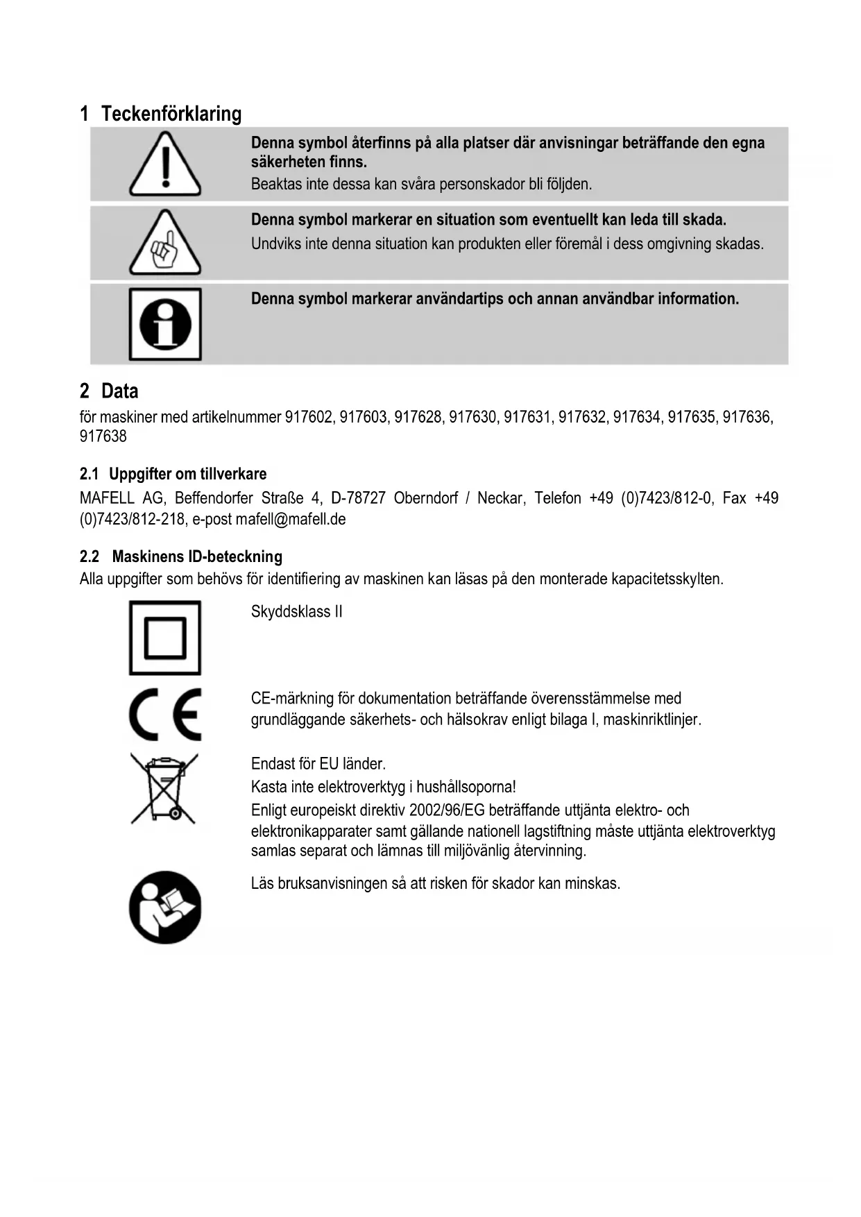 Denna symbol markerar användartips och annan användbar information. 2 Data för maskiner med artikelnummer 917602, 917603, 917628, 917630, 917631, 917632, 917634, 917635, 917636,