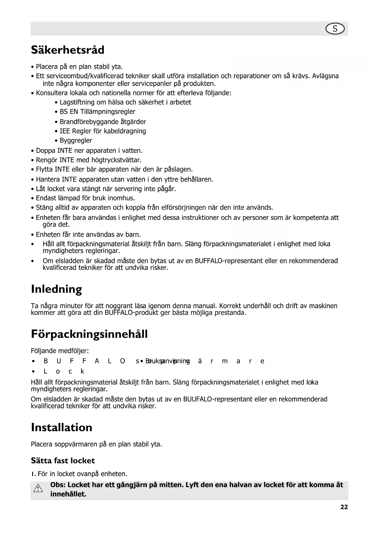 - Om elsladden är skadad måste den bytas ut av en BUFFALO-representant eller en rekommenderad kvalificerad tekniker för att undvika risker. Inledning Ta några minuter för att noggrant läsa igenom denna manual. Korrekt underhåll och drift av maskinen kommer att göra att din BUFFALO-produkt ger bästa möjliga prestanda. Förpackningsinnehåll Följande medföljer: Håll allt förpackningsmaterial åtskiljt från barn. Släng förpackningsmaterialet i enlighet med loka myndigheters regleringar. Om elsladden är skadad måste den bytas ut av en BUUFALO-representant eller en rekommenderad kvalificerad tekniker för att undvika risker. Installation Placera soppvärmaren på en plan stabil yta. Sätta fast locket