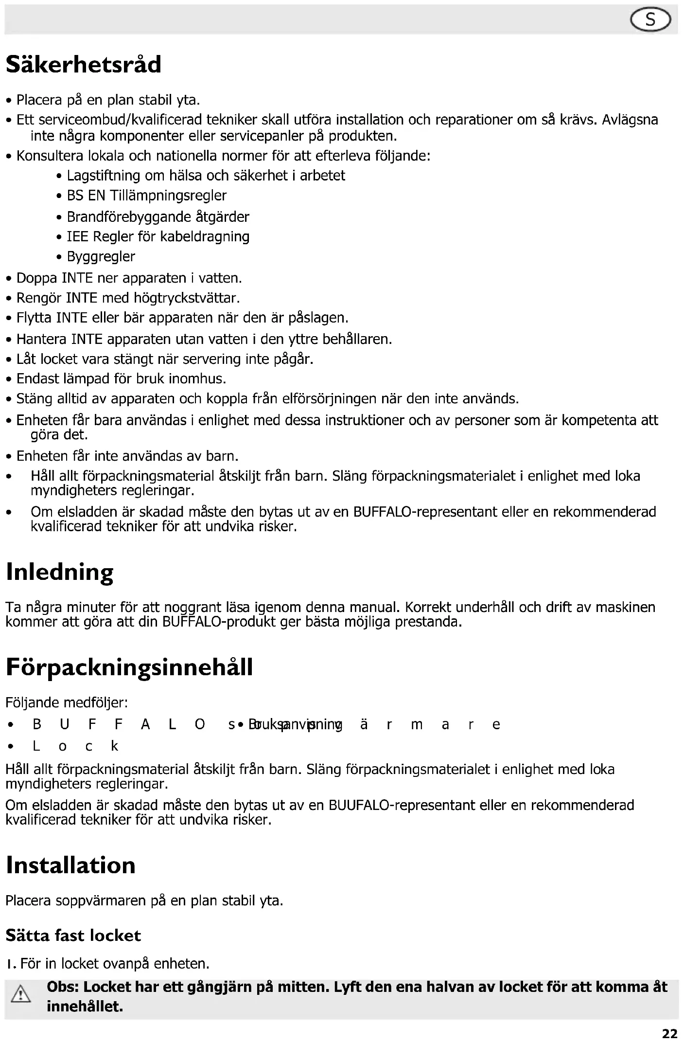 - Om elsladden är skadad måste den bytas ut av en BUFFALO-representant eller en rekommenderad kvalificerad tekniker för att undvika risker. Inledning Ta några minuter för att noggrant läsa igenom denna manual. Korrekt underhåll och drift av maskinen kommer att göra att din BUFFALO-produkt ger bästa möjliga prestanda. Förpackningsinnehåll Följande medföljer: Håll allt förpackningsmaterial åtskiljt från barn. Släng förpackningsmaterialet i enlighet med loka myndigheters regleringar. Om elsladden är skadad måste den bytas ut av en BUUFALO-representant eller en rekommenderad kvalificerad tekniker för att undvika risker. Installation Placera soppvärmaren på en plan stabil yta. Sätta fast locket