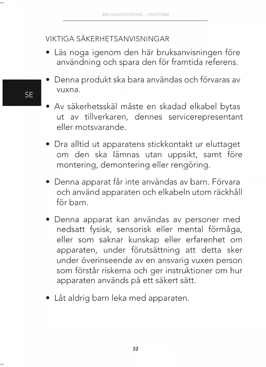 - Denna apparat får inte användas av barn. Förvara och använd apparaten och elkabeln utom räckhåll för barn.