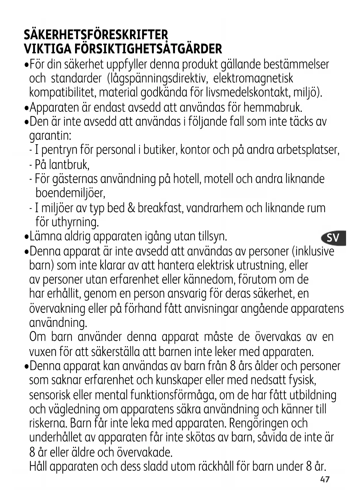- Denna apparat kan användas av barn från 8 års ålder och personer som saknar erfarenhet och kunskaper eller med nedsatt fysisk, sensorisk eller mental funktionsförmåga, om de har fått utbildning och vägledning om apparatens säkra användning och känner till riskerna. Barn får inte leka med apparaten. Rengöringen och underhållet av apparaten får inte skötas av barn, såvida de inte är 8 år eller äldre och övervakade. Håll apparaten och dess sladd utom räckhåll för barn under 8 år.