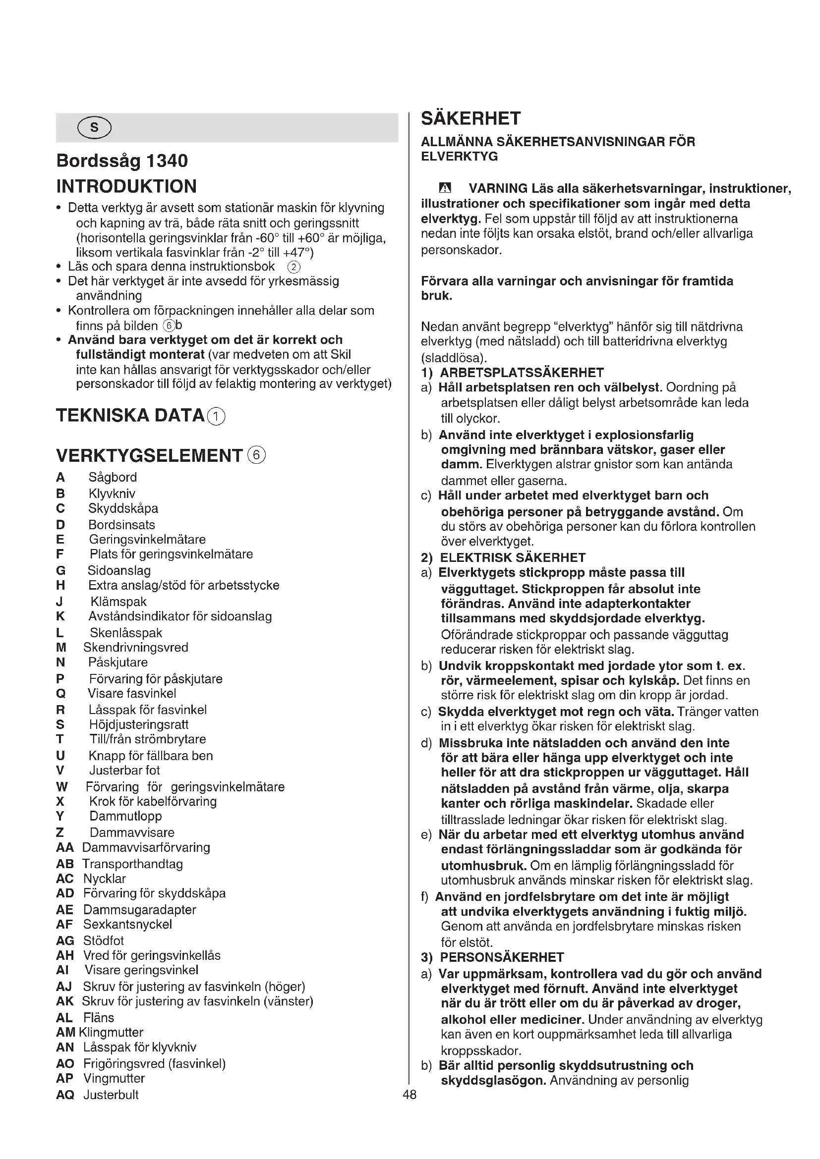 A Sågbord B Klyvkniv C Skyddskåpa D Bordsinsats E Geringsvinkelmätare F Plats för geringsvinkelmätare G Sidoanslag H Extra anslag/stöd för arbetsstycke J Klämspak K Avståndsindikator för sidoanslag L Skenlåsspak M Skendrivningsvred N Påskjutare P Förvaring för påskjutare Q Visare fasvinkel R Låsspak för fasvinkel S Höjdjusteringsratt T Till/från strömbrytare U Knapp för fällbara ben V Justerbar fot W Förvaring för geringsvinkelmätare X Krok för kabelförvaring Y Dammutlopp Z Dammavvisare AA Dammavvisarförvaring AB Transporthandtag AC Nycklar AD Förvaring för skyddskåpa AE Dammsugaradapter AF Sexkantsnyckel AG Stödfot AH Vred för geringsvinkellås AI Visare geringsvinkel AJ Skruv för justering av fasvinkeln (höger) AK Skruv för justering av fasvinkeln (vänster) AL Fläns AM Klingmutter AN Låsspak för klyvkniv AO Frigöringsvred (fasvinkel) AP Vingmutter AQ Justerbult49 h) Håll handtag och greppytor torra, rena och fria från olja och fett. Hala handtag och greppytor ger ingen säker hantering och kontroll över verktyget i oväntade situationer.