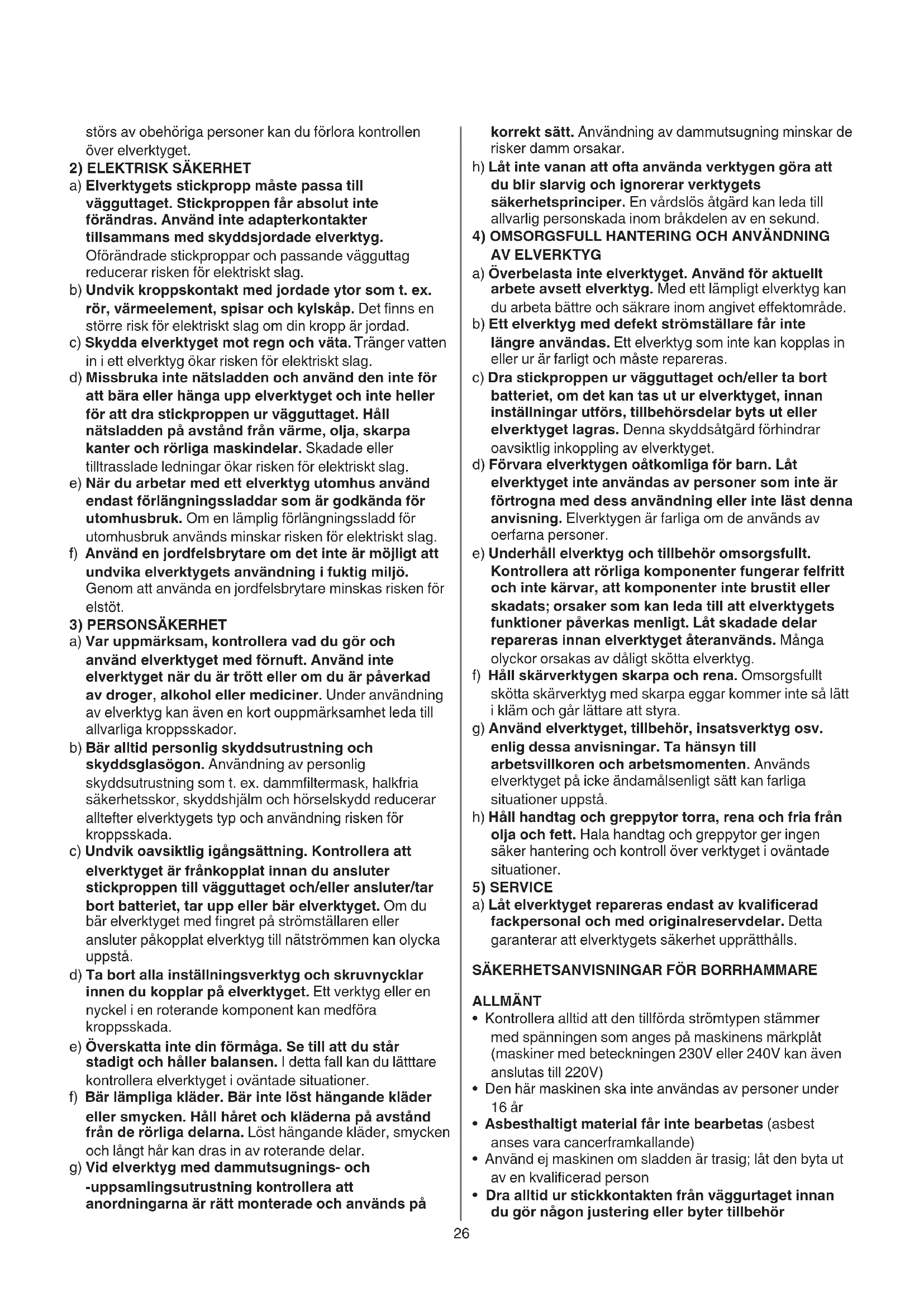 - Maskinen är avsedd för hammarborrning i betong, tegel och sten samt för lättare mejslingsarbete; för borrning i trä, metall och plast samt för skruvdragning måste specikt tillbehör användas