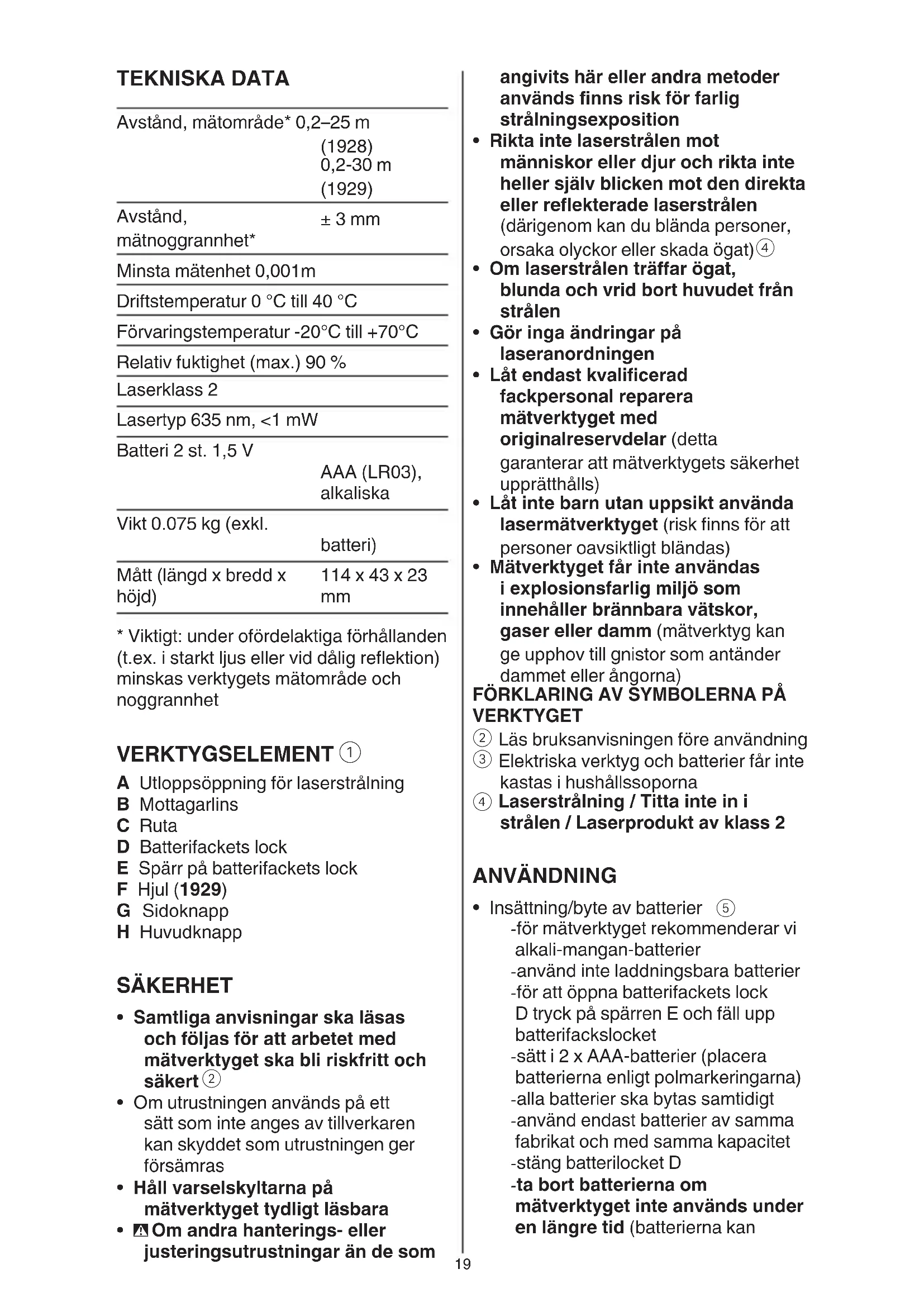 - för mätverktyget rekommenderar vi alkali-mangan-batterier - använd inte laddningsbara batterier - för att öppna batterifackets lock D tryck på spärren E och fäll upp batterifackslocket - sätt i 2 x AAA-batterier (placera batterierna enligt polmarkeringarna) - alla batterier ska bytas samtidigt - använd endast batterier av samma fabrikat och med samma kapacitet - stäng batterilocket D - ta bort batterierna om mätverktyget inte används under en längre tid (batterierna kan TEKNISKA DATA Avstånd, mätområde* 0,2–25 m (1928) 0,2-30 m (1929) Avstånd, mätnoggrannhet* ± 3 mm Minsta mätenhet 0,001m Driftstemperatur 0 °C till 40 °C Förvaringstemperatur -20°C till +70°C Relativ fuktighet (max.) 90 % Laserklass 2 Lasertyp 635 nm, <1 mW Batteri 2 st. 1,5 V AAA (LR03), alkaliska Vikt 0.075 kg (exkl. batteri) Mått (längd x bredd x höjd) 114 x 43 x 23