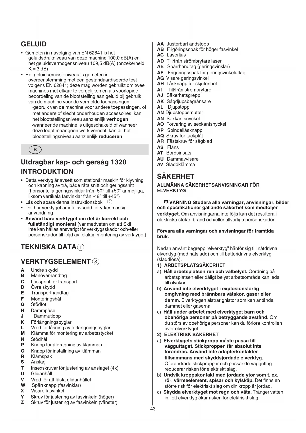 - bij de zaaglijn mag geen ruimte bestaan tussen het werkstuk en de geleider of de zaagtafel - indien noodzakelijk, maak een hulpgeleider; de gaten in de schuifgeleider worden dan gebruikt om de43 AA Justerbart ändstopp AB Frigöringsspak för höger fasvinkel AC Laserljus AD Till/från strömbrytare laser AE Spärrhandtag (geringsvinklar) AF Frigöringsspak för geringsvinkeluttag AG Visare geringsvinkel AH Låsknapp för skjutenhet AI Till/från strömbrytare AJ Säkerhetsgrepp AK Sågdjupsbegränsare AL Djupstopp AM Djupstoppsmutter AN Sexkantsnyckel AO Förvaring av sexkantsnyckel AP Spindellåsknapp AQ Skruv för täckplåt AR Fästskruv för sågblad AS Fläns AT Bordsinsats AU Dammavvisare AV Sladdklämma SÄKERHET