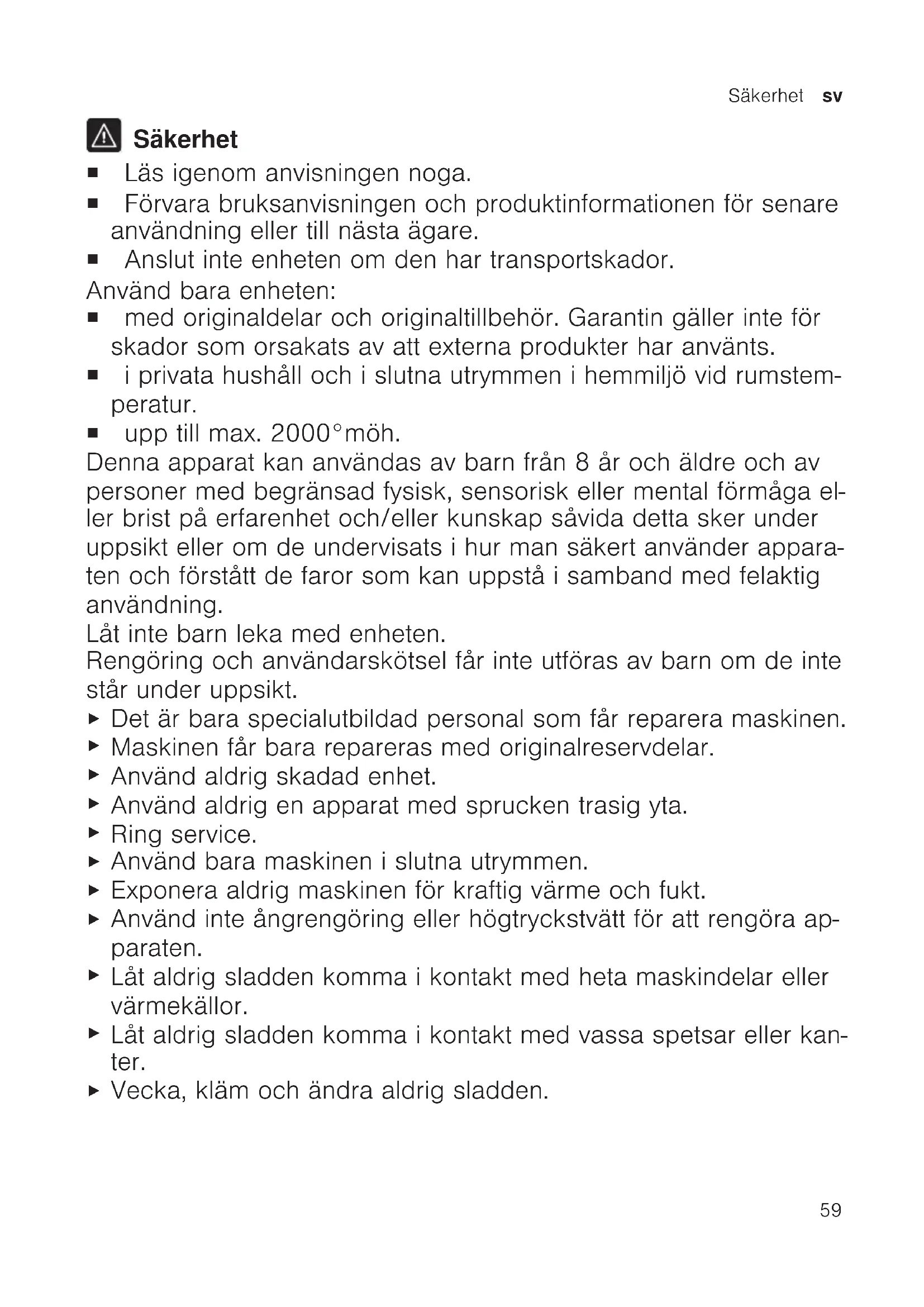 Säkerhet ¡ Läs igenom anvisningen noga. ¡ Förvara bruksanvisningen och produktinformationen för senare användning eller till nästa ägare. ¡ Anslut inte enheten om den har transportskador. Använd bara enheten: ¡ med originaldelar och originaltillbehör. Garantin gäller inte för skador som orsakats av att externa produkter har använts. ¡ i privata hushåll och i slutna utrymmen i hemmiljö vid rumstem- peratur. ¡ upp till max. 2000°möh. Denna apparat kan användas av barn från 8år och äldre och av personer med begränsad fysisk, sensorisk eller mental förmåga el- ler brist på erfarenhet och/eller kunskap såvida detta sker under uppsikt eller om de undervisats i hur man säkert använder appara- ten och förstått de faror som kan uppstå i samband med felaktig användning. Låt inte barn leka med enheten. Rengöring och användarskötsel får inte utföras av barn om de inte står under uppsikt.