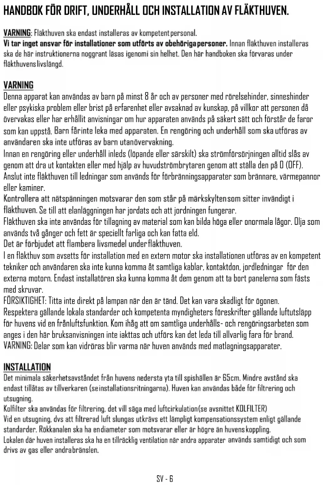 Denna apparat kan användas av barn på minst 8 år och av personer med rörelsehinder, sinneshinder eller psykiska problem eller brist på erfarenhet eller avsaknad av kunskap, på villkor att personen då övervakas eller har erhållit anvisningar om hur apparaten används på säkert sätt och förstår de faror som kan uppstå. Innan en rengöring eller underhåll inleds (löpande eller särskilt) ska strömförsörjningen alltid slås av genom att dra ut kontakten eller med hjälp av huvudströmbrytaren genom att ställa den på 0 (OFF). Anslut inte fläkthuven till ledningar som används för förbränningsapparater som brännare, värmepannor eller kaminer. Se till att elanläggningen har jordats och att jordningen fungerar. Fläkthuven ska inte användas för tillagning av material som kan bilda höga eller onormala lågor. Olja som används två gånger och fett är speciellt farliga och kan fatta eld. I en fläkthuv som avsetts för installation med en extern motor ska installationen utföras av en kompetent tekniker och användaren ska inte kunna komma åt samtliga kablar, kontaktdon, jordledningar för den externa motorn. Endast installatören ska kunna komma åt dem genom att ta bort panelerna som fästs med skruvar. FÖRSIKTIGHET: Titta inte direkt på lampan när den är tänd. Det kan vara skadligt för ögonen. Respektera gällande lokala standarder och kompetenta myndigheters föreskrifter gällande luftutsläpp för huvens vid en frånluftsfunktion. Kom ihåg att om samtliga underhålls- och rengöringsarbeten som anges i den här bruksanvisningen inte iakttas och utförs kan det leda till allvarlig fara för brand. Delar som kan vidröras blir varma när huven används med matlagningsapparater.