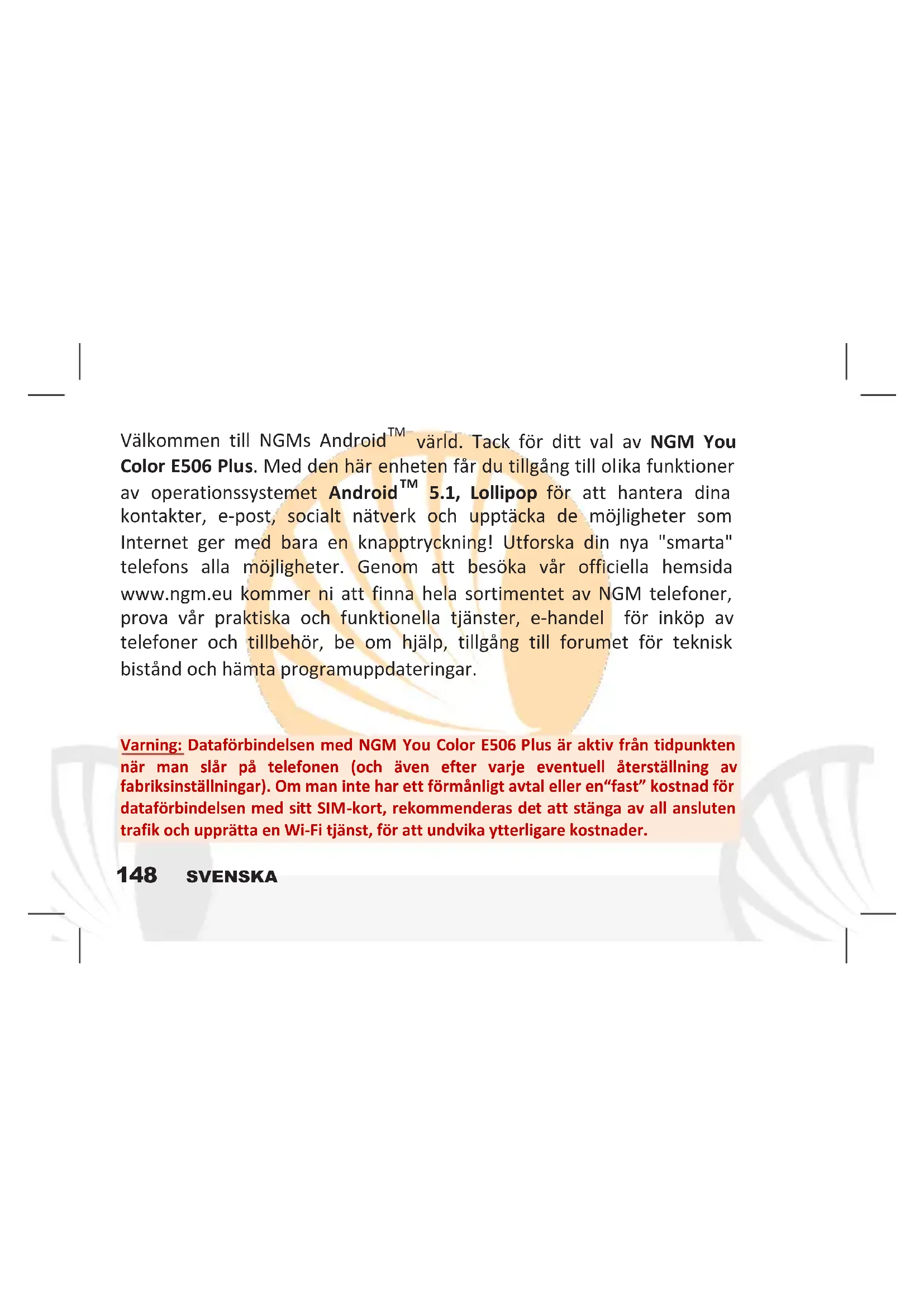 värld. Tack för ditt val av NGM You Color E506 Plus. Med den här enheten får du tillgång till olika funktioner av operationssystemet Android